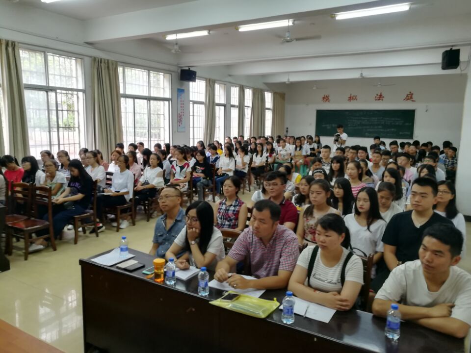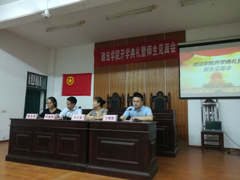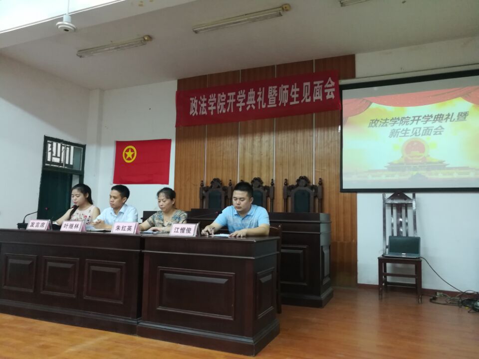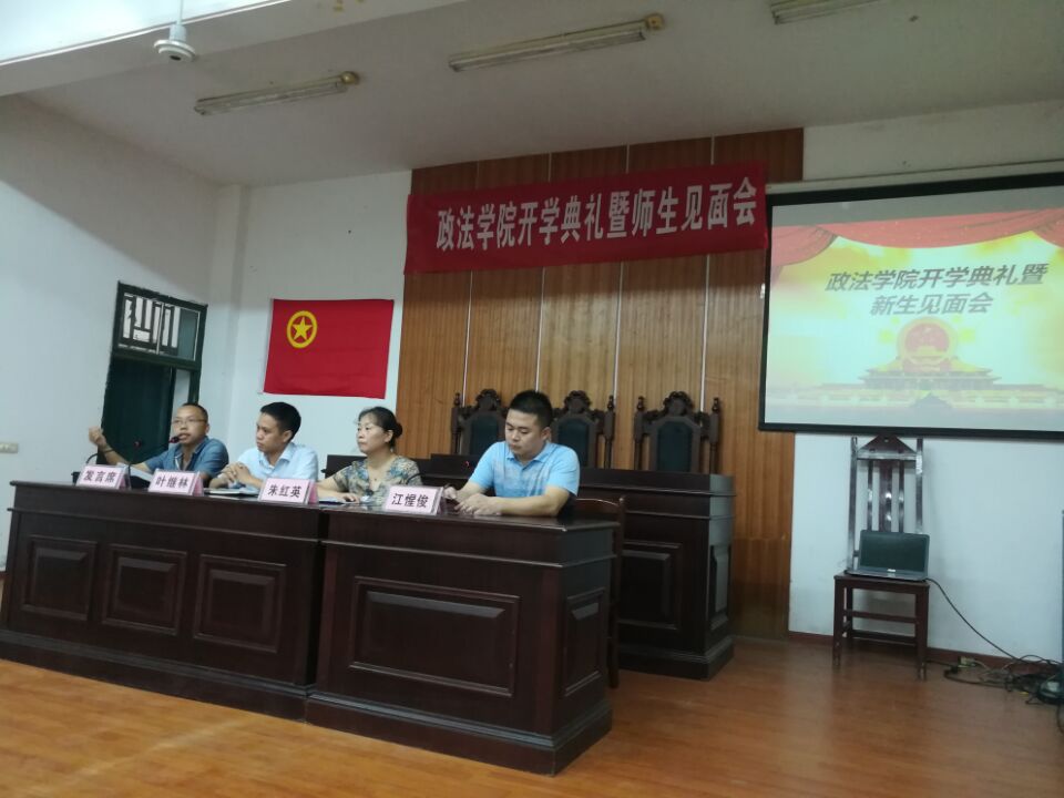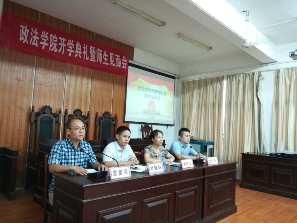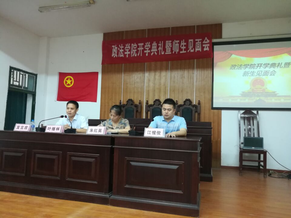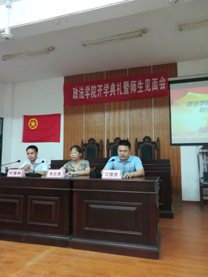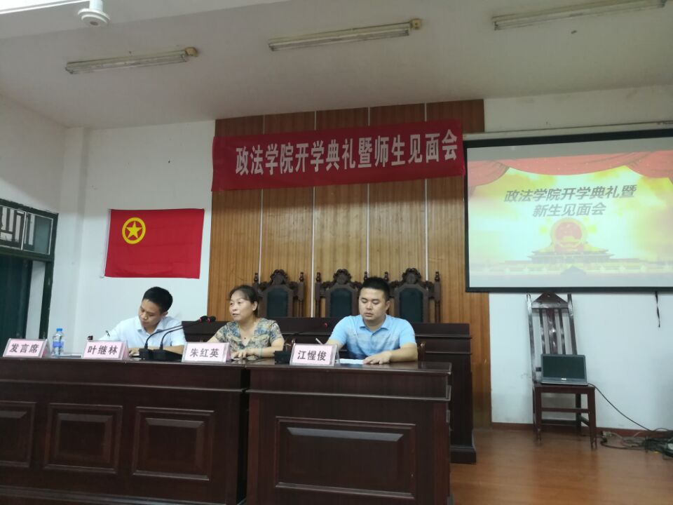2017年9月11日上午,政法学院在模拟法庭(英华楼一楼)隆重召开开学典礼暨师生见面会,院长朱红英、院党总支书记叶继林、副书记江惺俊、2017级新生及相关师生代表参加会议。会议由江惺俊主持。