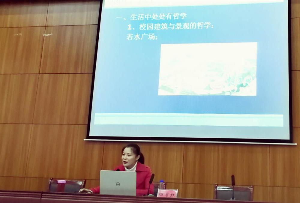 讲座伊始,田常红以“生活周边的哲学”开题,以若水广场、至善楼和跬步楼等校园景观为例,向同学们传达了“上善若水”、“止于至善”、“格物致知”等哲理。继而,她阐述了“日常用而不知的哲学”,如孝悌、耕读传家、四海之内皆兄弟等,让同学们深刻理解了其中的哲学蕴味;结合十九大报告,辨析了“老有所养、住有所居、弱有所扶”的小康社会提法的哲学依据,并殷切希望同学们将自己的人生目标与国家的“两个一百年”奋斗目标密切结合。最后,她以“生命中的哲学”作结,由儒到道,对儒道的价值观作了深入的分析,并告诫同学们要做到“物物而不物于物”。讲座最后,她希望同学们了解、热爱哲学,多读哲学原典。