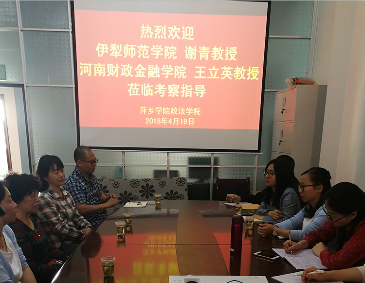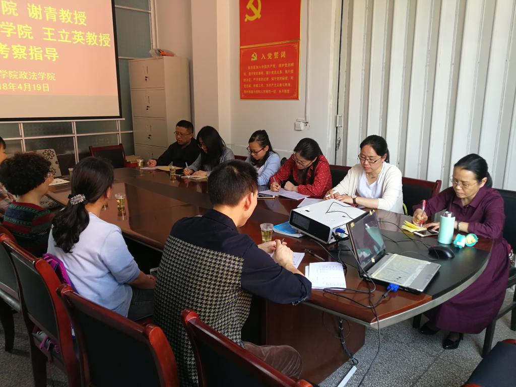 2018年4月19日下午,伊犁师范学院马克思主义学院谢青教授、河南财政金融学院文学院王立英教授一行来到政法学院,就思政课教学工作等事项进行考察交流,政法学院院长朱红英、思政专业教研室主任乔兰、就业指导与军事理论教研室主任陈方前及其他思政课教师参加了会议,会议由朱红英主持。