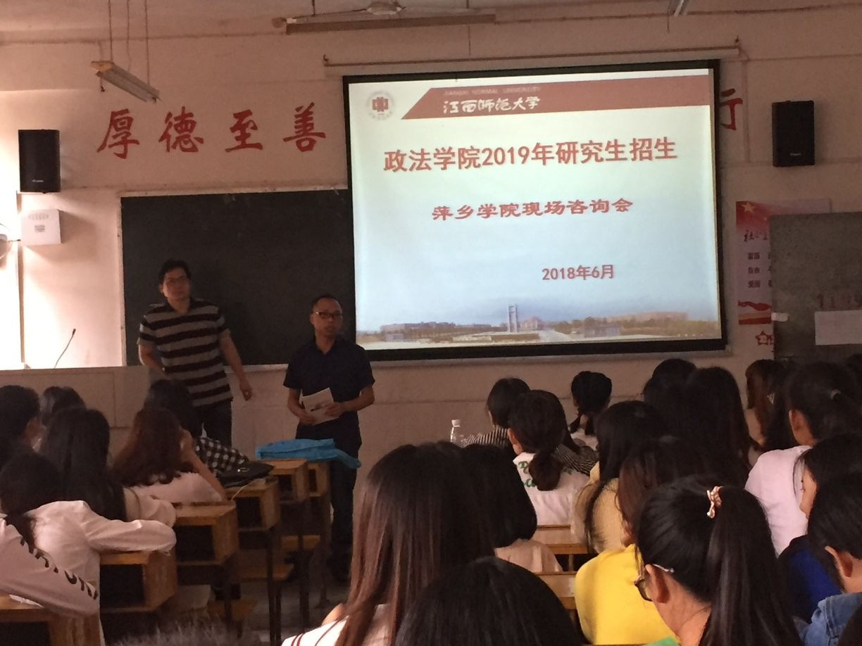 2018年6月1日,江西师范大学政法学院副院长蒋九愚一行,应邀莅临我院进行研究生招生宣传。政法学院凌焰博士主持宣讲会并致欢迎词,团总支书记罗燕妮、16思政班主任乔兰出席宣讲会。政法学院全体本科学生参加了此次宣讲会。