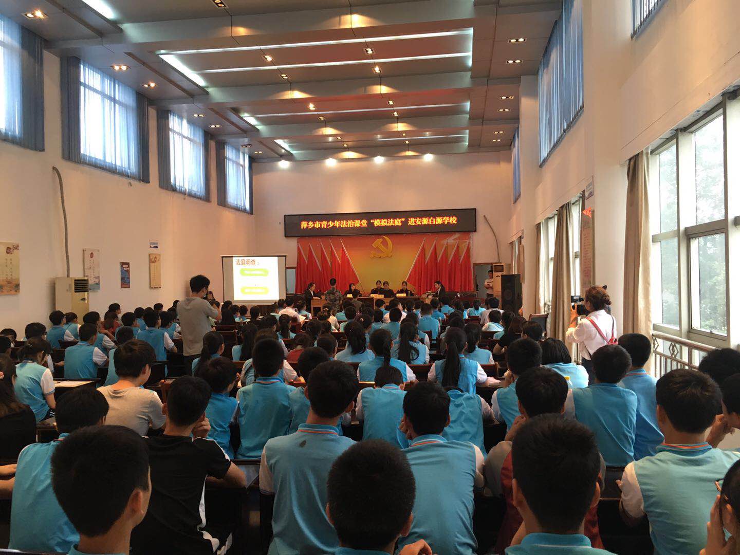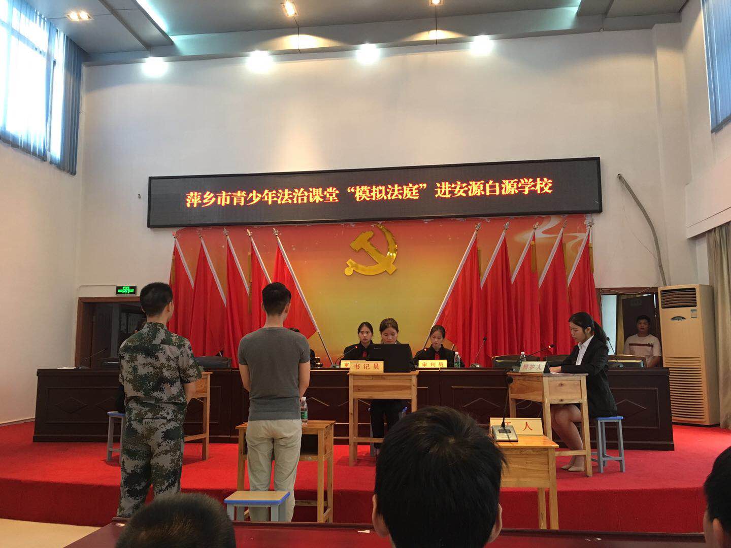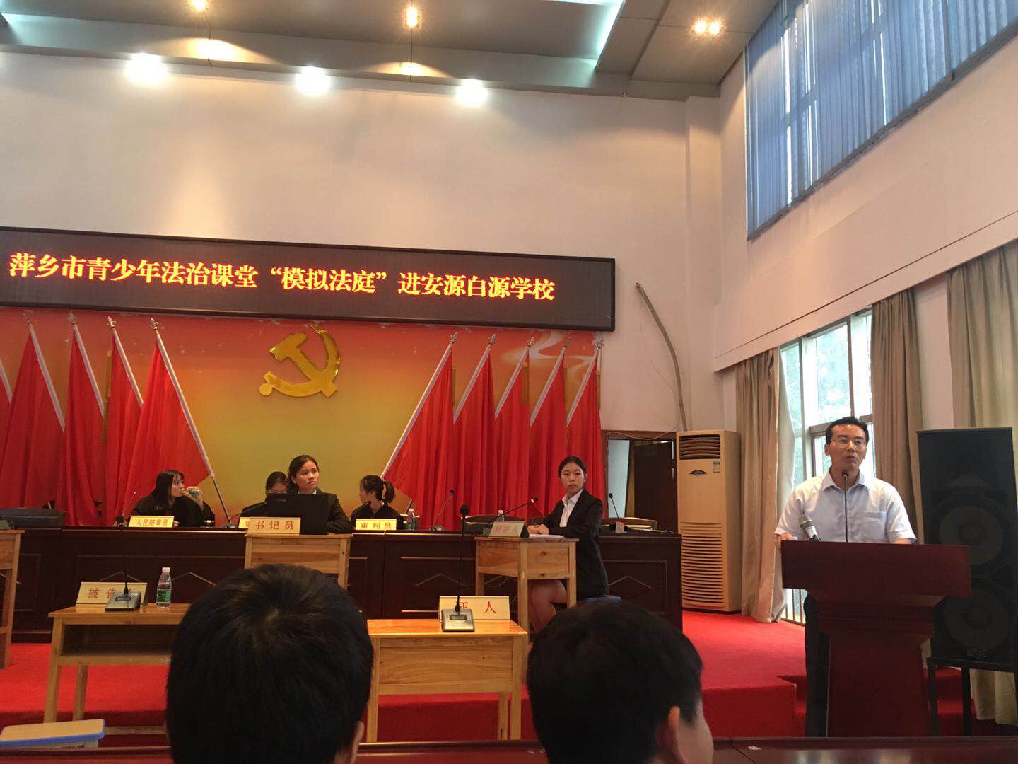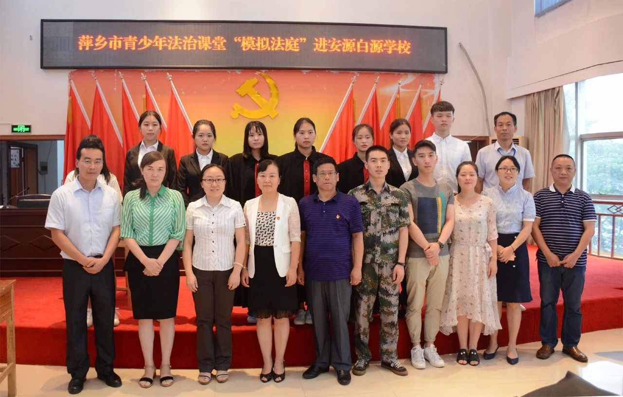 为加强法治宣传,预防青少年犯罪,6月14日下午,萍乡市司法局、市教育局、市团委、白源街道和安源区司法局主办,萍乡学院政法学院和白源学校承办的模拟法庭进校园活动在白源街道办五楼会议室举办。来自白源学院的近200名学生观摩了庭审。市司法局党组成员、副局长周群,团市委副书记陈益敏、市教育局副调研员颜德荣,白源街道和安源区司法局代表,萍乡学院政法学院和白源学校的部分老师到场观摩。