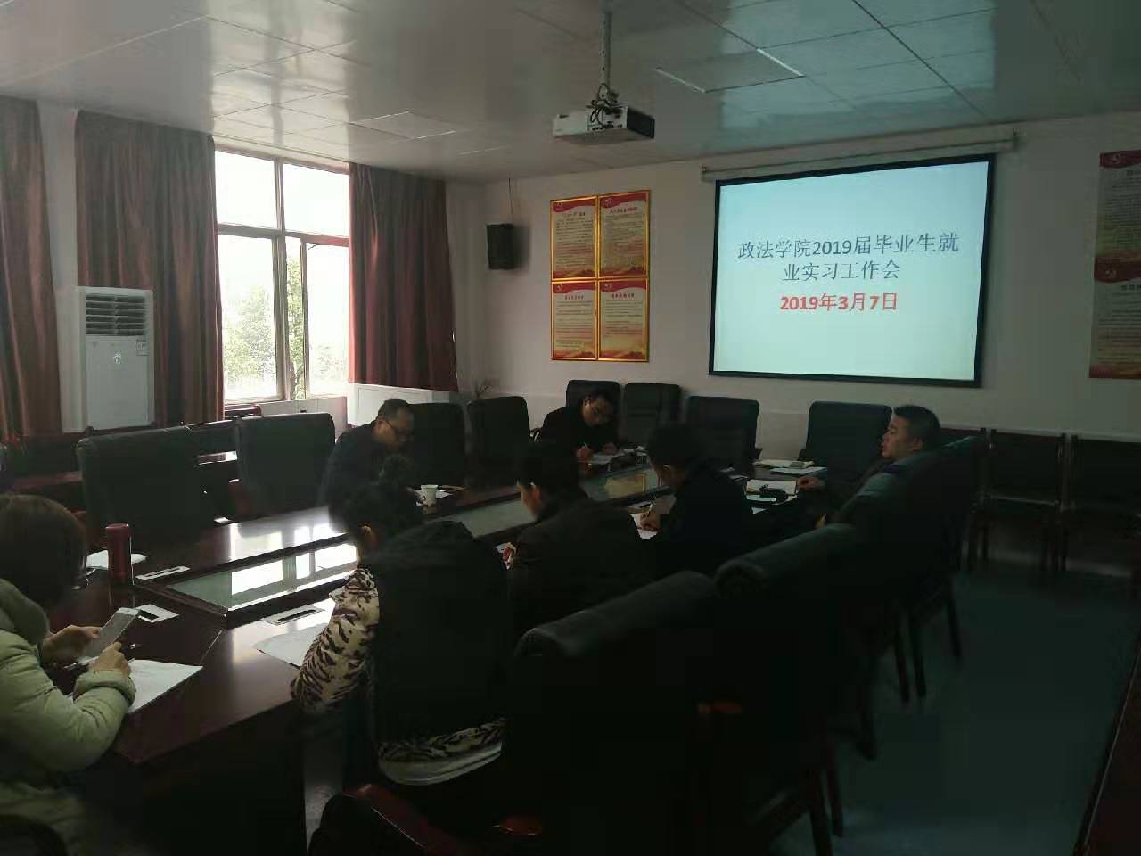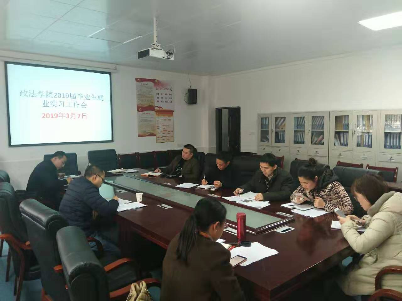 2019年3月7日下午,政法学院在院会议室召开了2019届毕业生就业工作会。院党总支书记叶继林出席并主持会议,院长朱红英、党总支副书记江惺俊、副院长凌焰、陈方前教授、钱力副教授、法律教研室主任张洪峰、16法律班班主任陈冉老师、邹甜老师以及辅导员兼就业干事陈尧嘉等参加会议。