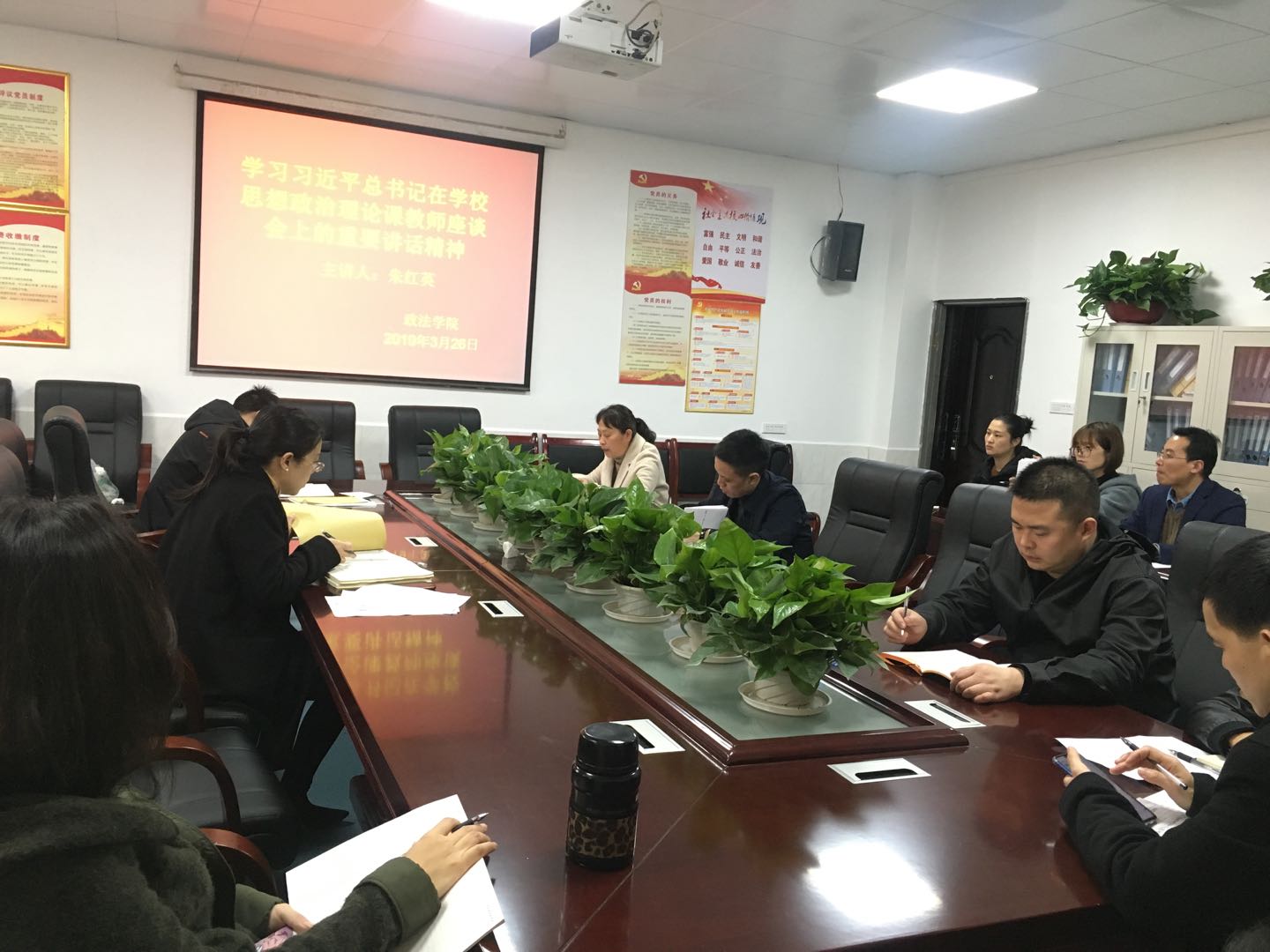 3月26日中午,政法学院在二楼会议室举行学习习近平总书记在学校思想政治理论课教师座谈会上重要讲话精神座谈会。党总支书记叶继林、副书记江惺俊、副院长凌焰及全体思政课教师参加会议。院长朱红英主持座谈会。