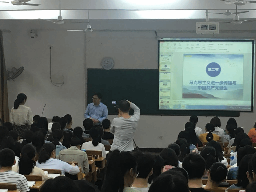 在教学中,胡艺华教授首先用电影《建党伟业》主题曲《有一天》导入课程内容,接着观看视频《马克思主义在中国的广泛传播》,对早期马克思主义者的队伍、马克思主义者思想运动的特点等进行了阐述,最后,胡艺华教授将《南湖红船》的悠扬歌曲与中国共产党的早期组织、早期组织的活动、中国共产党第一次全国代表大会、中国共产党成立的历史特点和意义以及中国共产党的创建及意义等教学内容联结起来,一一讲解.