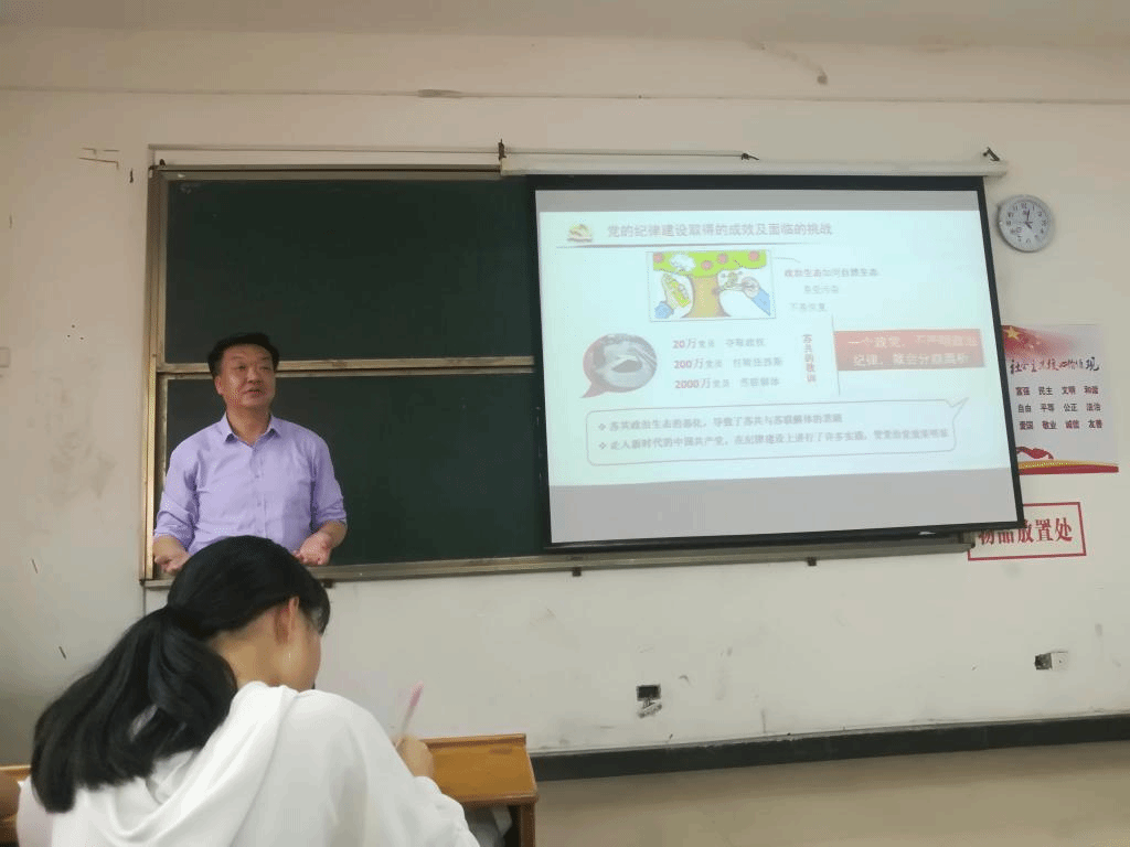 为深入学习贯彻习近平总书记在学校思政课教师座谈会上重要讲话精神,推动习近平新时代中国特色社会主义思想进课堂、进头脑,5月15日,校党委委员、副校长郭伟为18级英语本科和18级汉语言文学本科专业的同学讲授“形势与政策”课程中“用铁的纪律管党治党”这一专题。