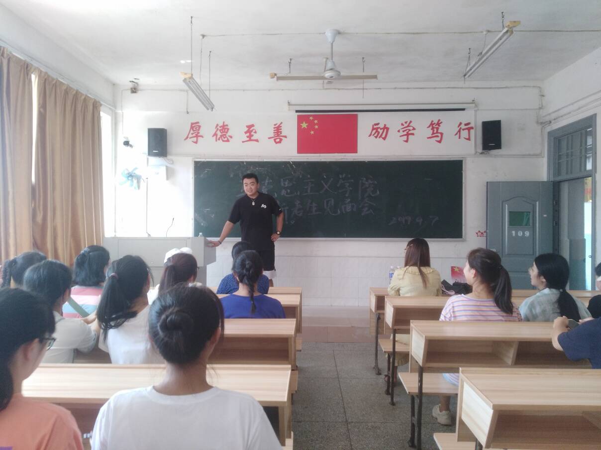 2019年9月7日,马克思主义学院在跬步楼1103教室举行2019级新老生见面会。学生会主席周俊杰、团总支副书记陈芮娴、学生会副主席廖妍婷等老生学生代表和全体大一新生参加本次大会。