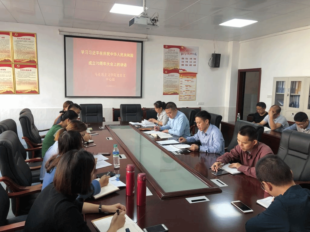 为深入学习贯彻习近平总书记庆祝中华人民共和国成立70周年大会上的讲话精神,深刻认识中华人民共和国成立70年的光辉历程、伟大成就和宝贵经验,10月9日,马克思主义学院党总支在院会议室组织开展了党总支中心组学习,全体教职工党员参加学习。