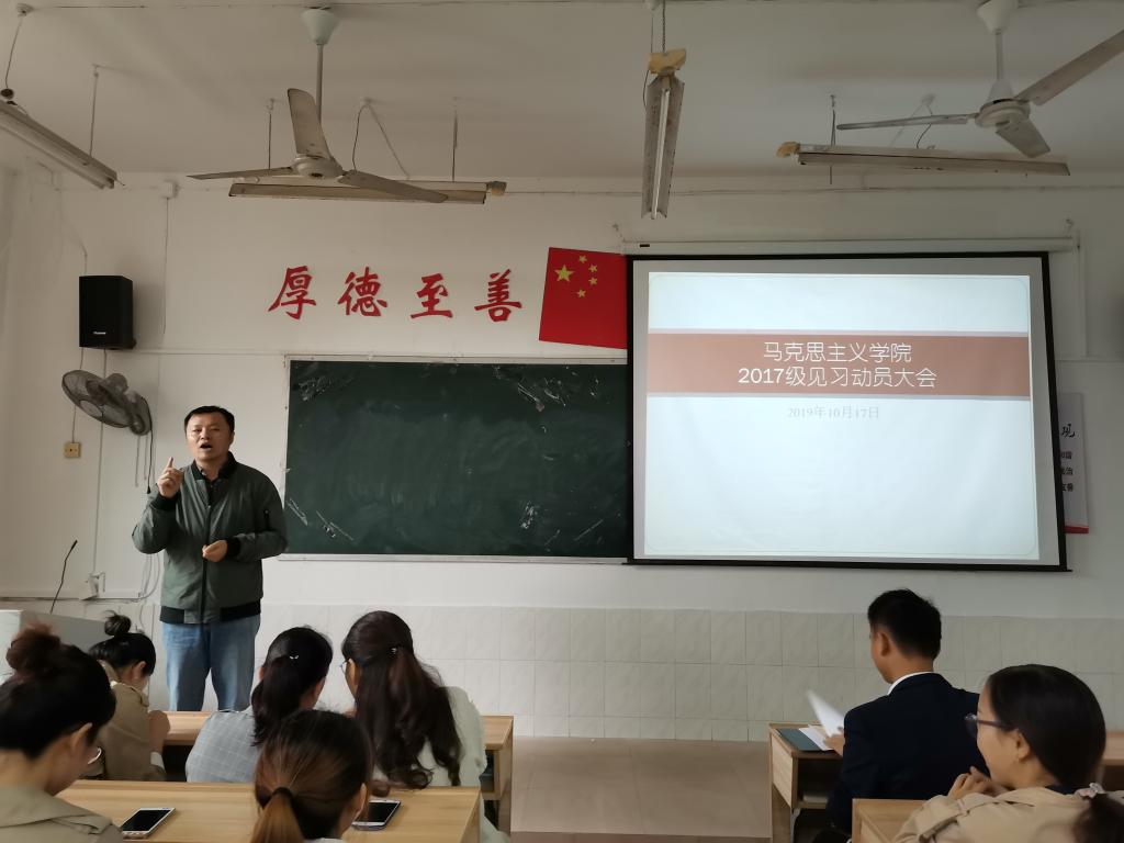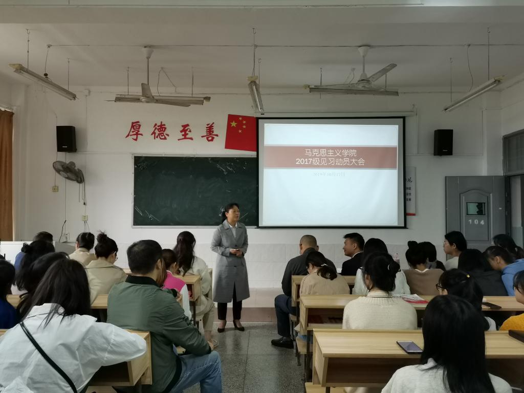为促进教育教学见习工作的顺利展开,提高学生对中学教育教学现状及教学方式的了解,增强学生理论联系实际的水平。2019年10月17日,17思政班于跬步楼1104教室举办了“马克思主义学院2017级见习动员大会”,张帆老师主持此次动员活动,马克思主义学院院长朱红英教授及十位指导老师出席本次活动,17思政班全体同学参与本次会议。