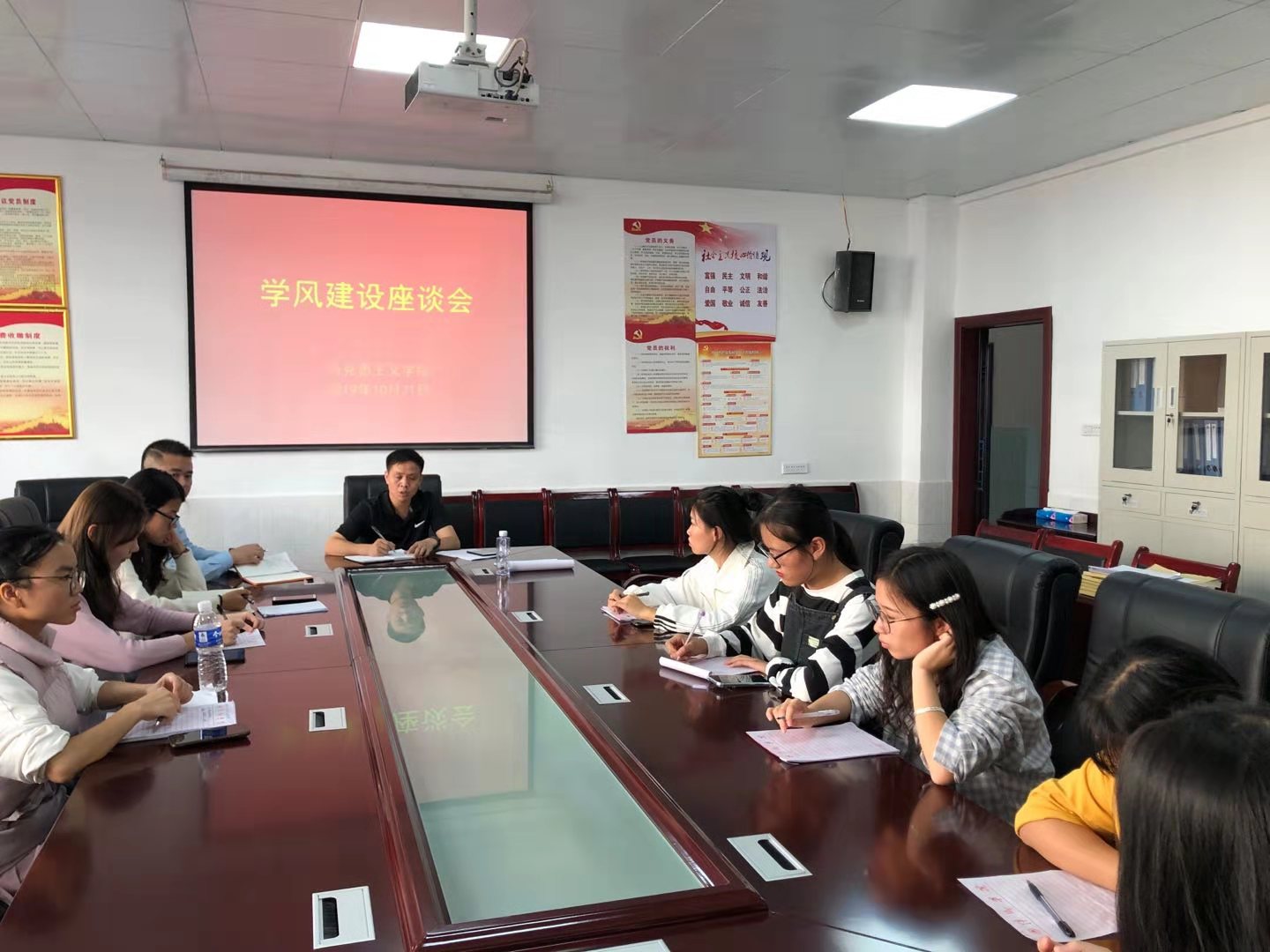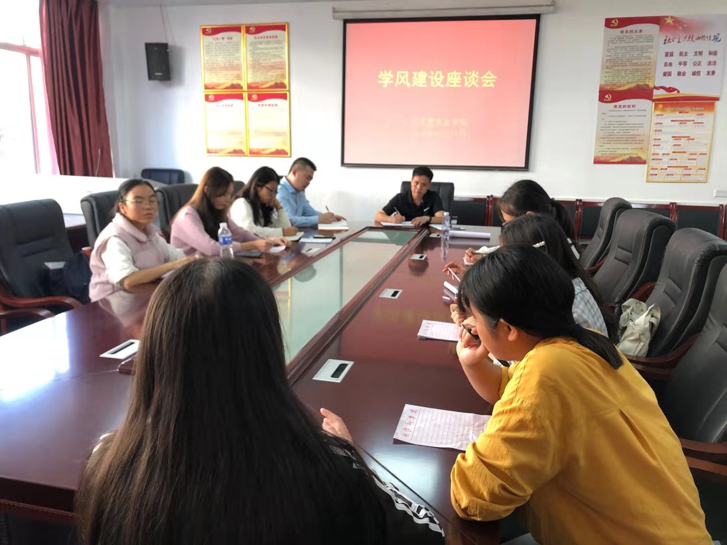 为增浓我院学风,提高我院教学培养的质量,全面了解学生对学院学风建设的评价及建议,10月21号中午,马克思主义学院党总支书记叶继林、党总支副书记江惺俊、辅导员王建芳和18级思想政治教育专业黄美兰等10位同学在院会议室召开了一场畅所欲言的学风建设座谈会。