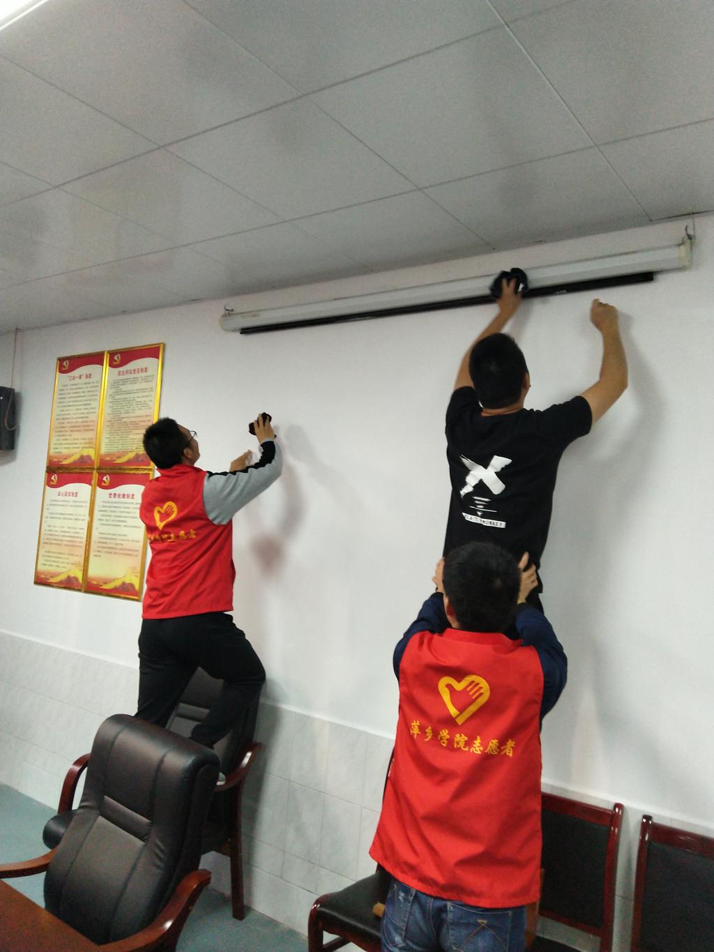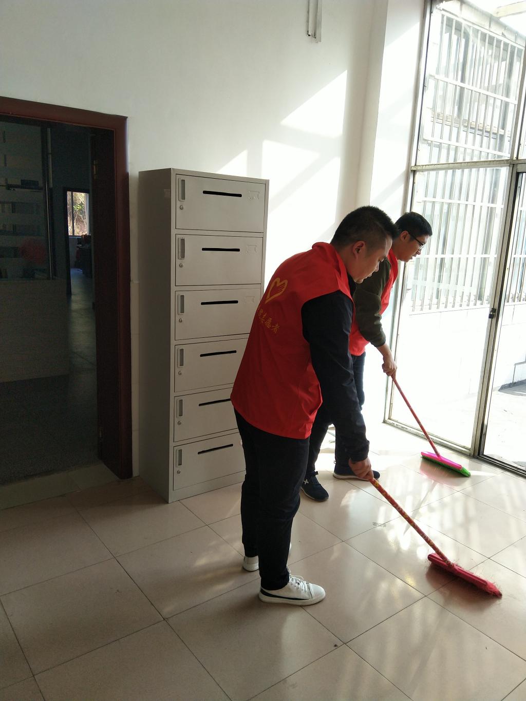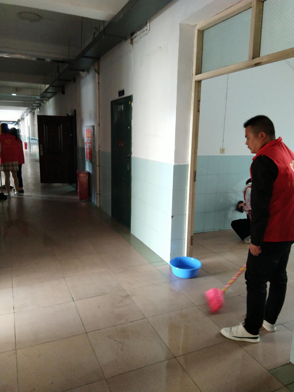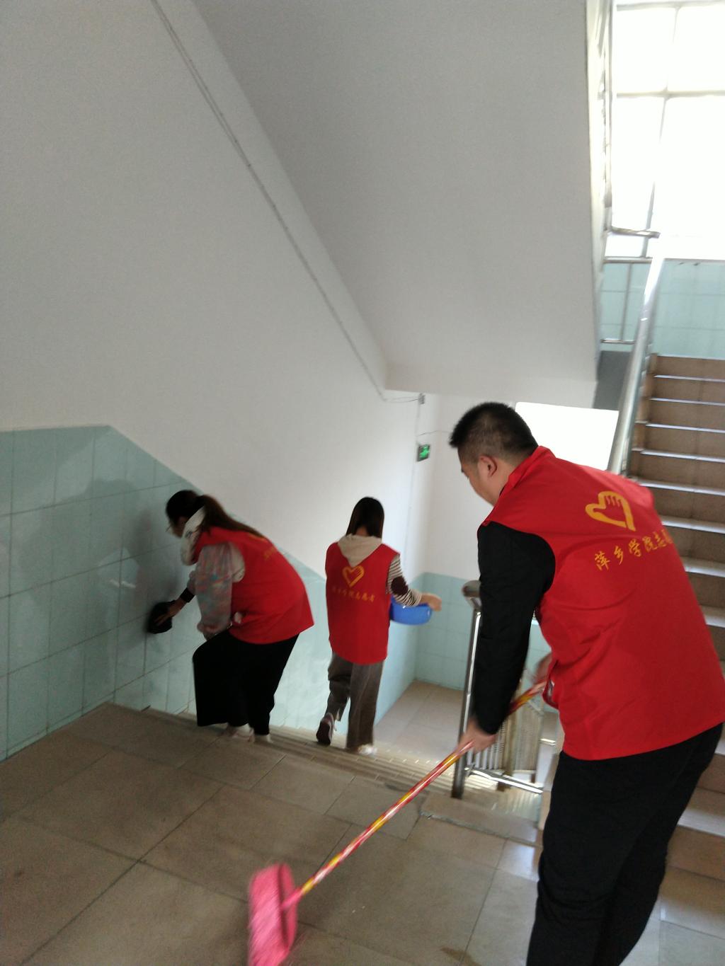 大家带来抹布、脸盆、钢丝球等工具,对会议室的窗户、投影幕布、墙面、桌面、地面以及公共楼道等区域进行了认真清扫。在劳动中,党员们热情似火,干劲十足,以劳动为荣,乐在其中。