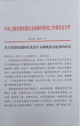近日,中共上海市浦东新区金杨新村街道工作委员会下发《关于表彰疫情防控先进个人和优秀志愿者的决定》, 我院16思政班周俊杰荣获“疫情防控优秀志愿者”称号。