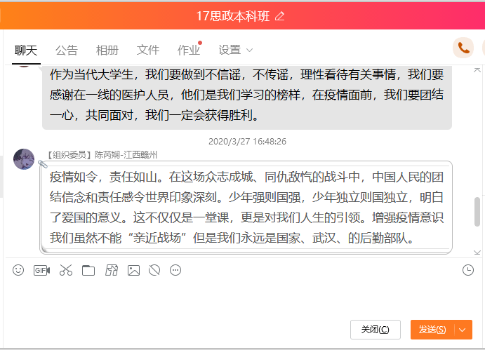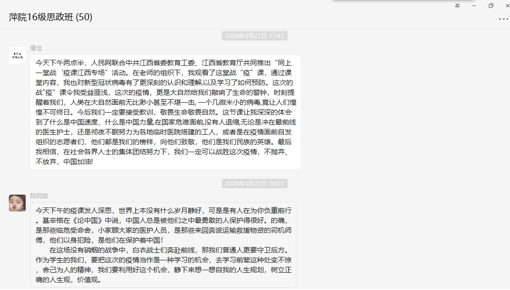 16思政罗发娣:今天,看了同上堂一战“疫”课,让我记忆深刻。对中国在疫情中的担当让我感到骄傲自豪,同时也对江西人民在此次战疫中做出的贡献而自豪。生于这样的国家,何其荣幸?中国战“疫”,凝聚中国力量,彰显大国担当。这力量与担当体现在举国上下一心,不遗余力调配各类资源,力争做到应收尽收、不漏一人;体现在基层社区严防死守,外防输入,内防扩散,不留死角;体现在火神山医院、雷神山医院接连建成,超级速度,超级震撼;体现在战“疫”线屡屡上演“最美逆行”,汇聚中国力量,众志成城,共克时艰。越是苦难越自律,越是艰险越向前。一场重大疫情,也是一场人生大课。我们要科学理性有思想,我们要珍惜生命爱自然,我们要胸怀信仰敢担当,我们一起为大写的青春描绘一个大写的梦想,努力做胸有大志、心有大我、肩怀大任、行有大德的新时代有为青年!