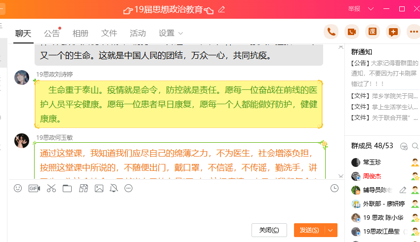 19思政王姝:这是一场没有硝烟的战争,是不允许失败的战争,每个人都不能置身事外,船到中流浪更急,人到半山路更陡,我们唯有不忘初心、牢记使命,团结奋斗,持续发力,砥砺前行,为我们默默守护,守护安宁,守护健康,守护幸福!致敬在抗疫前线的医务工作者!国务院领导同志亲临一线,向全国发出动员令医务人员沖上去了,同病魔奋力搏击;科技人员冲上去了,他们夜以继日、合力攻关,力图早日攻克病毒的关隘;新闻记者冲传播党和政府的声音,报道疫情和无数感人的事迹…危难时刻,亿万人民在民族精神的感召下,筑起了一座抗击病毒疫情的钢铁长城。
