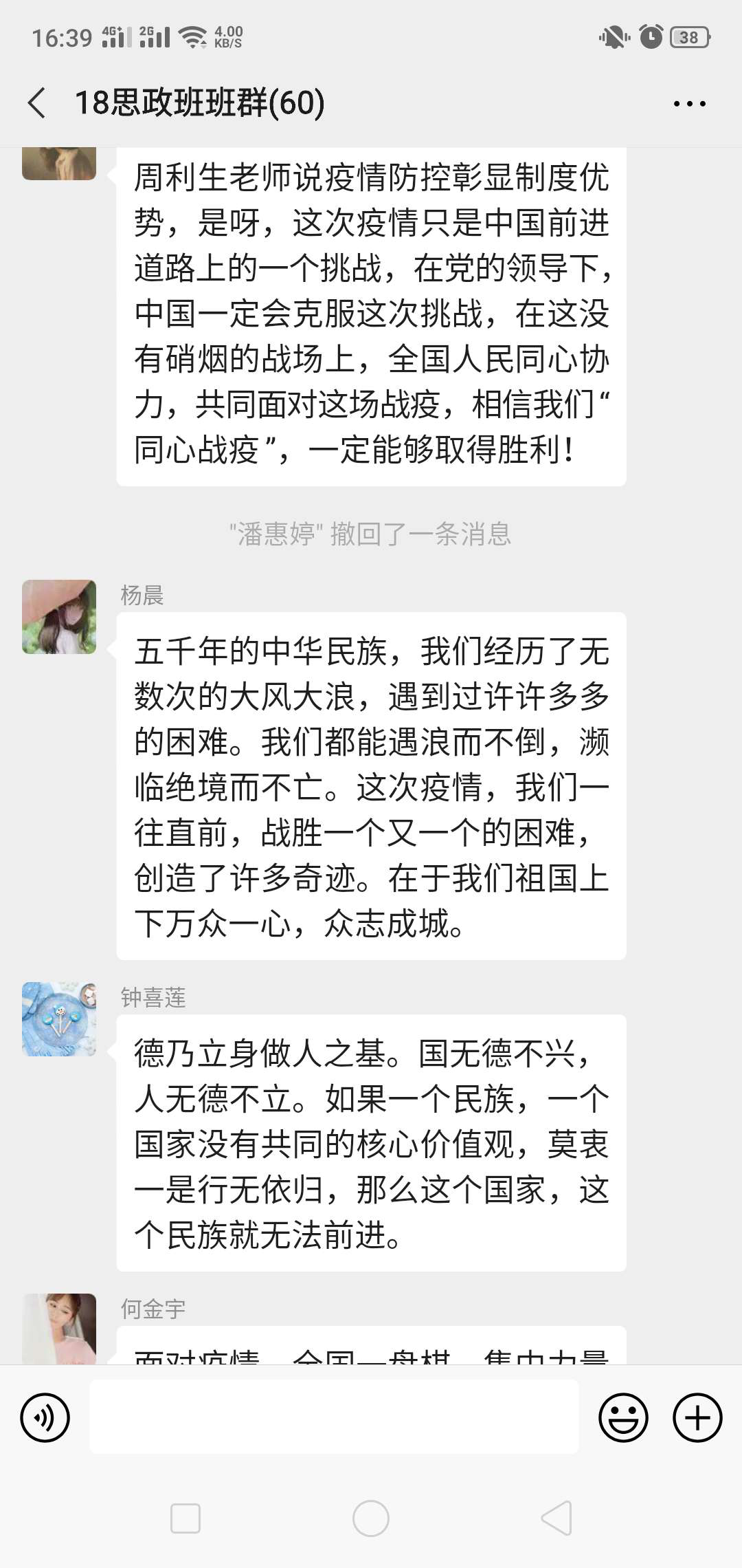 17思政杨素芬:面对疫情,全党全局全国各民族人民都站在一起,心连着心,携手抵抗疫情。白衣天使为我们奋战一线,也涌现了很多抗疫英雄,他们无私奉献,在这场抗疫战。做出了巨大贡献。作为大学生,我们能做的就是不添乱,注意个人卫生,呼吁身边的人不给国家添乱。同时,我们在家也要努力学习,不荒废不颓废,不能因为开学延迟而懈怠,为抗疫作出绵薄之力。