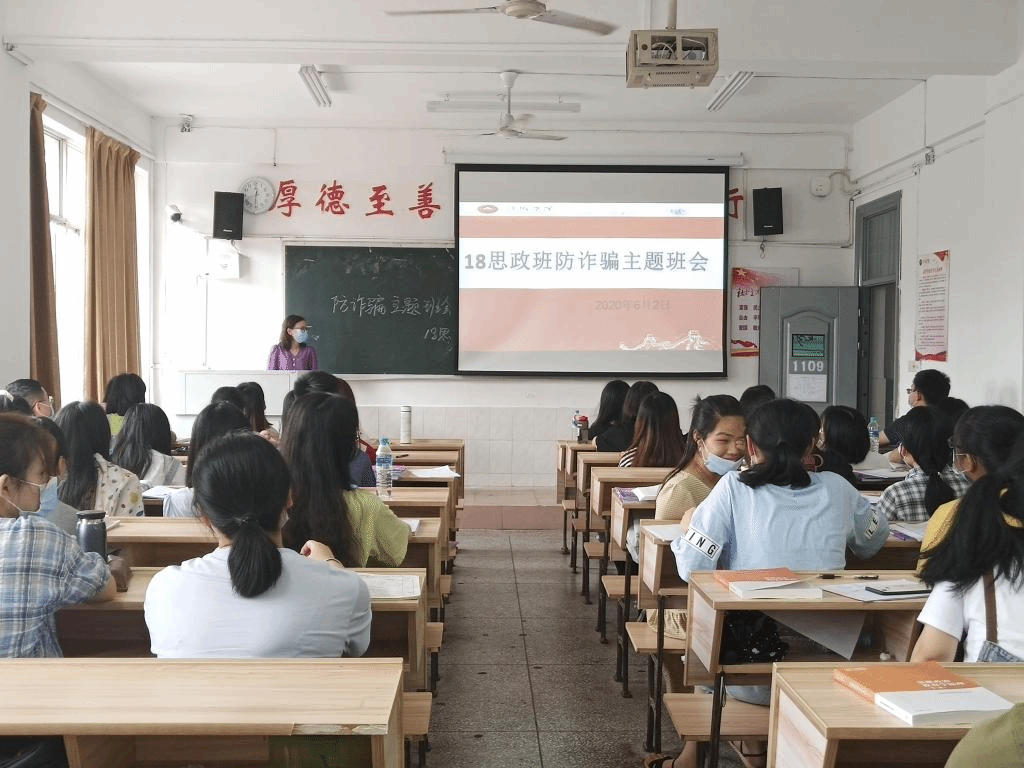 随着信息技术的发展,社会中出现了很多诈骗现象,很多诈骗分子将目标转向学生。为了增强学生安全防范意识,提高自我防范能力,熟悉日常生活中的诈骗形式,18思政班于2020年6月2日上午在1109教室举行了防诈骗主题班会。班会由辅导员王建芳老师,班主任张珊老师主持召开,参与人员为18思想政治教育班全体同学。