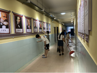2020月6日23日下午,马克思主义学院学生党支部组织党员在跬步楼楼道、学院会议室进行“不忘初心,‘疫’路同心”主题党日清扫劳动。