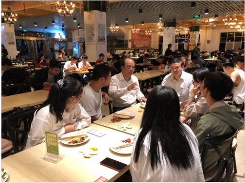 作为“双体验日”活动的一个重要环节——体验一天学生生活,与学生同学习同生活同劳动。陈金印书记来到第一食堂,按照学生日常就餐标准,买了一份饭菜,与学生们共进晚餐,与同学们拉起了家常,就学生们普遍关心的餐饮、生活、学习、工作等方面情况进行交淡。详细了解同学们的生活消费情况,对食堂饭菜价格、质量、服务等是否满意。陈金印关切地询问同学们饭菜价格怎样?饭菜质量怎样?分量够不够?吃得好不好?能否吃得饱……。听着陈书记的亲切询问,同学们纷纷畅所欲言,大家对目前学院饭堂的环境、饭菜质量和服务质量给予了肯定,同时也提出了自己的意见和建议,希望食堂菜式能更多一些。就餐结束后,陈金印和同学们共同践行“光盘行动”和“垃圾分类”,以此鼓励更多的师生身体力行。