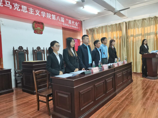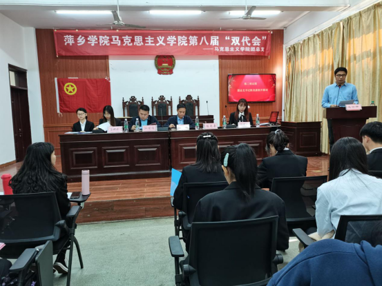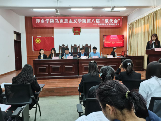 2020年11月12日中午12时30分,萍乡学院马克思主义学院团总支于英华楼模拟法庭召开第八届“双代会”。出席本次大会的有院党总支书记叶继林,党总支副书记江惺俊,团总支书记陈尧嘉,团总支学生分会主席廖妍婷,团总支副书记陈芮娴,团总支学生分会全体系干及各兄弟学院学生分会主席、团总支副书记和部分班级学生代表。