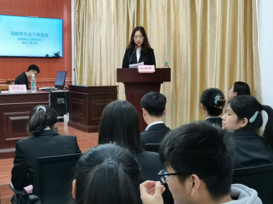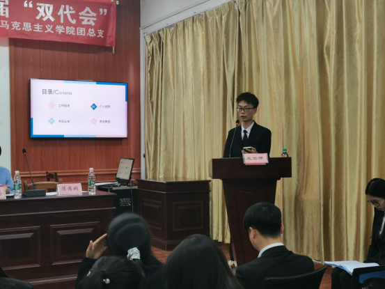 大会第一项,主持人陈芃宇介绍出席大会的领导及来宾。大会第二项,主持人宣布大会开幕。大会第三项,奏国歌,全体人员起立唱国歌。大会第四项,团总支书记陈尧嘉致开幕词。大会第五项,团总支副书记陈芮娴宣读萍乡学院马克思主义学院第八届“双代会”代表资格审查报告。大会第六项,团总支学生分会主席廖妍婷代表萍乡学院马克思主义学院第八届团总支学生分会作工作报告。大会第七项,团总支分会组织部部长张露萍宣读萍乡学院马克思主义学院第八届团总支分会执委部长选举办法。大会第八项,马克思主义学院执委部长竞聘开始,各位竞聘者依次上台发言,并且向全体人员表达自己的竞选意愿并展示自己的竞争优势。大会第九项,党总支副书记江惺俊致闭幕词并庆祝马克思主义学院第八届“双代会”顺利结束。大会第十项,国际歌庄严响起,大会在国际歌中闭幕,全体人员有序离场,圆满完成了预定议程。
