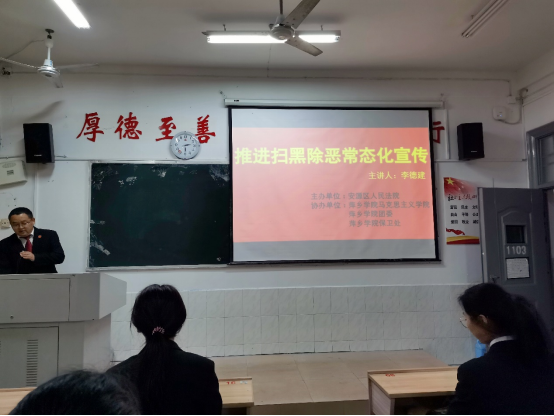 为切实保障学生们的合法权益,维护校园的和谐稳定,学习和贯彻落实《关于开展扫黑除恶专项斗争的通知》精神和全省扫黑除恶专项的决心。2021年12月16日下午,萍乡市安源区人民法院员额制法官李德建走进萍乡学院马克思主义学院开展主题讲座,19思政班全体同学参加,会上氛围融洽,同学们积极踊跃参与。