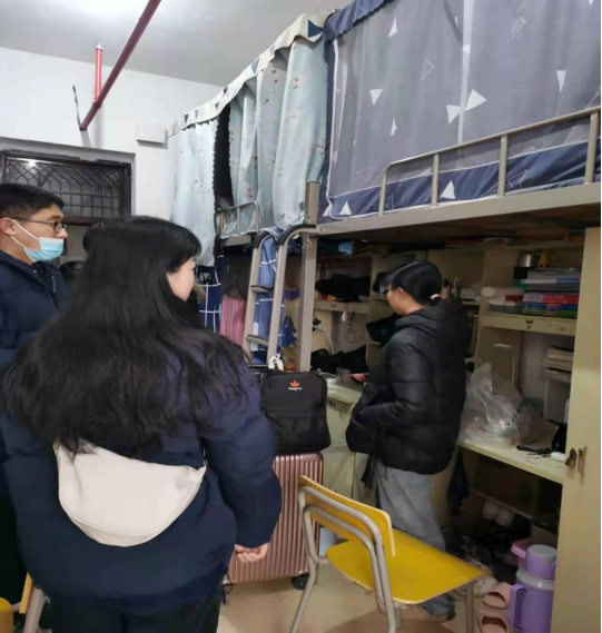 老师们着重检查了20思政班和19思政班的到校情况,受到了同学们的热烈欢迎。马克思主义学院党委负责人宋波同返校学生进行了面对面交流,亲切慰问了在寝同学,询问尚未到校学生的情况。宋书记仔细查看了学生宿舍的生活设施、清洁卫生、物品摆放、宿舍环境,着重强调了用电安全。