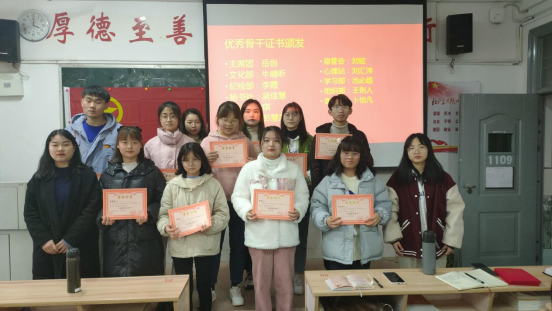 会议首先由主席团成员岳创讲话,他希望大家继续保持学院团委学生会干事作风的优良传统,在接下来的学院辩论赛中,各部门要积极配合工作,鼓励大家积极参与本学期的“红色走读”活动,开展同马克思主义学院专业相关的特色活动,发挥大家的专业优势。接下来由团副助理张婕讲话,她希望团委骨干和各班级同学要继续保持青年大学习的学习率以及注意“最美代言人”拍照的仪容仪表。之后由黄如光书记和陈尧嘉老师颁发第九届学生干部聘书,由学生会主席常玉珍及团委副书记伍清为优秀学生颁发骨干证书。会议的最后,陈尧嘉老师总结讲话,他肯定了各部门在上个学期的工作,对学生会全体成员予以厚望,鼓励大家积极参与团委学生会活动,不忘自己加入团委学生会的初心。
