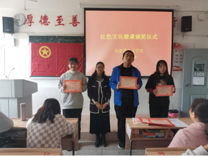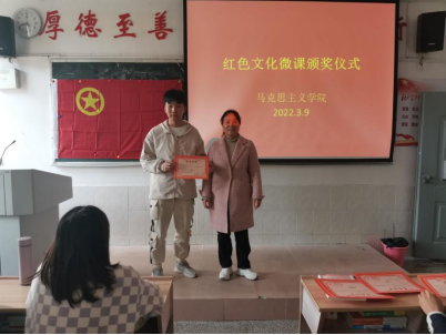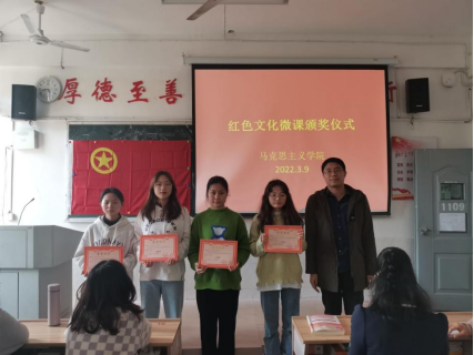 为进一步巩固党史学习教育成果,激励广大学生牢记百年党史、用好用活红色文化资源,传承好红色基因,马克思主义学院开展“红色文化”微课比赛。3月9日,颁奖仪式在跬步楼1109成功举行,马克思主义学院朱红英、陈尧嘉、刘根梅以及19思政班、20思政班部分学生参加。