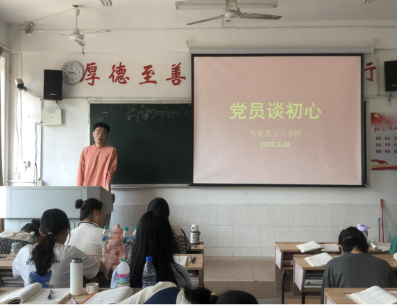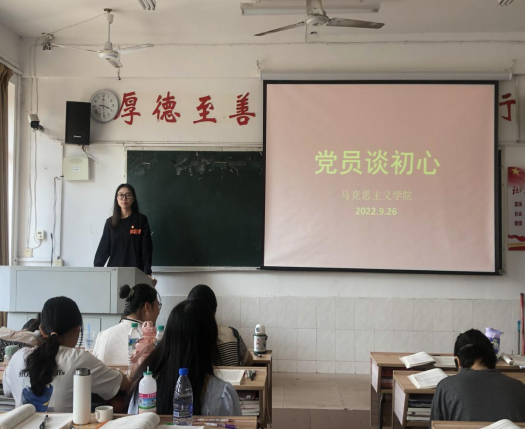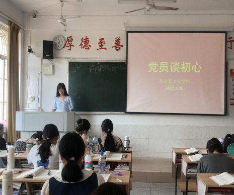 为积极推进院党委“五心”促“五型”教育实践活动,落实学校关于开展喜迎党的二十大“八个一”活动的相关工作部署,营造“喜迎二十大、奋进新征程”的浓厚氛围,马克思主义学院学生党支部于9月26日开展了“党员谈初心”活动。