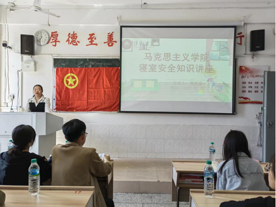 为增强学生们的寝室安全意识,提高寝室内务的管理水平,避免事故隐患的发生。马克思主义学院于10月18日中午开展寝室安全知识讲座,此次活动由学院团委宿管会主任黄滢滢同学主讲,陈尧嘉老师、段杉老师出席本次活动。
