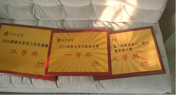 在本次军训中我院新生表现突出取得的优异成绩,以《歌唱祖国》作为参赛歌曲,荣获新生歌咏比赛一等奖。向成敏、陈明同学代表我院参加叠军被大赛,获得了三等奖。闭幕式当天,整齐迅速的摆字方阵和分列式,既展现了同学们刻苦训练的成果,也让马克思主义学院取得了2022级新生军训工作先进集体二等奖的好成绩。