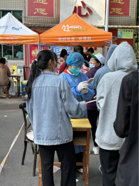 在全员核酸检测现场,志愿者们在做好自身防护的同时,服从安排,团结一致,与医护人员密切配合。认真开展扫码测温、核酸登记、维护秩序等工作,耐心提醒待检人员佩戴好口罩,保持“一米线”安全距离。