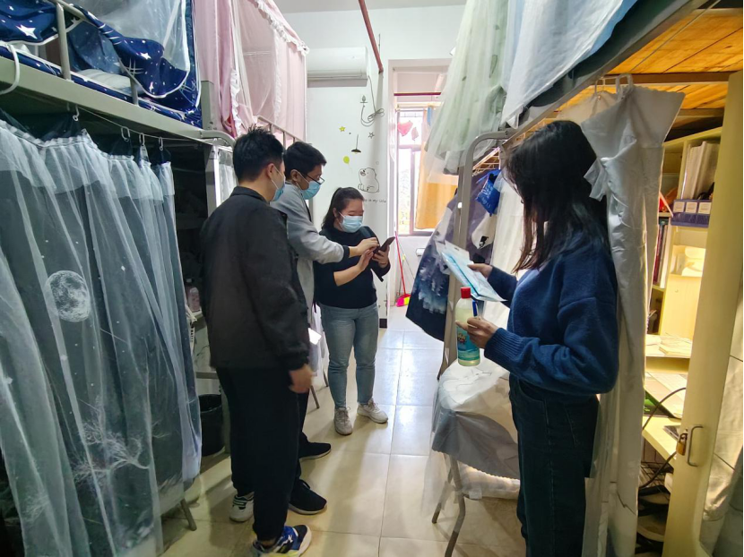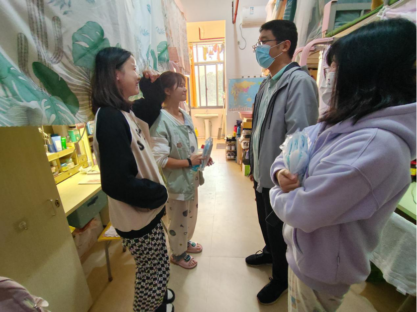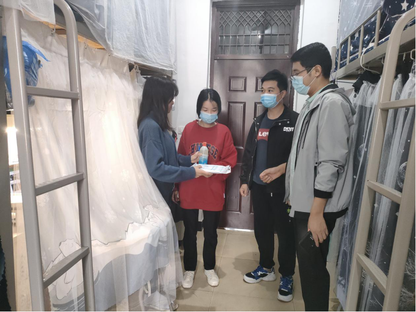 为进一步落实学校疫情防控工作,2022年11月8日下午,马克思主义学院党委副书记黄如光与学工科长陈尧嘉共同带领团委学生会成员为我院各个宿舍发放口罩、体温计与消毒液。