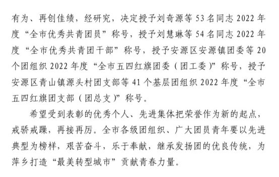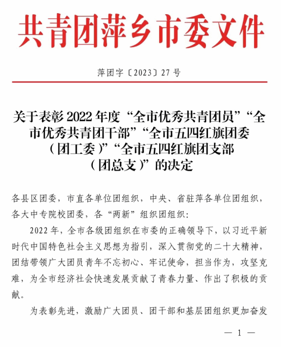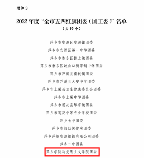 为表彰先进,激励广大团员、团干部和基层团组织更加奋进有为、再创佳绩,共青团萍乡市委印发《关于表彰2022年度“全市优秀共青团员”“全市优秀共青团干部”“全市五四红旗团委(团工委)”“全市五四红旗团支部(团总支)”的决定》,马克思主义学院团委荣获2022年度“全市五四红旗团委(团工委)”荣誉称号。