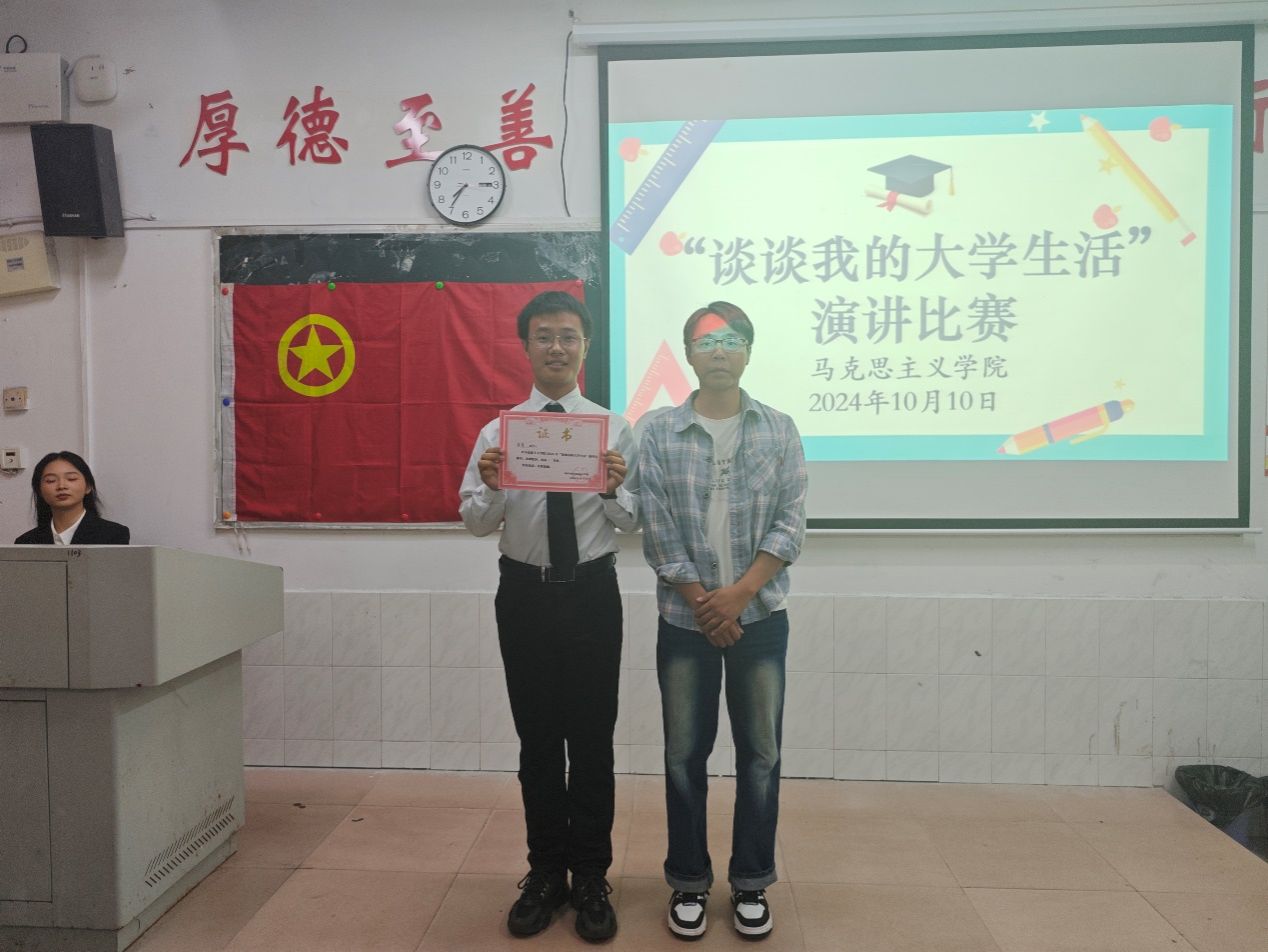 为引导学生关注自身成长和发展,培养学生的口头表达能力、思维能力和组织能力,马克思主义学院于10月10日在跬步楼1103教室举办"谈谈我的大学生活”主题演讲比赛。本次活动由马克思主义学院团委组织举行,马克思主义学院专任教师凌金云和22思政邱文慧以及23思政林松担任大赛评委,我院2024级部分同学到场参加。
