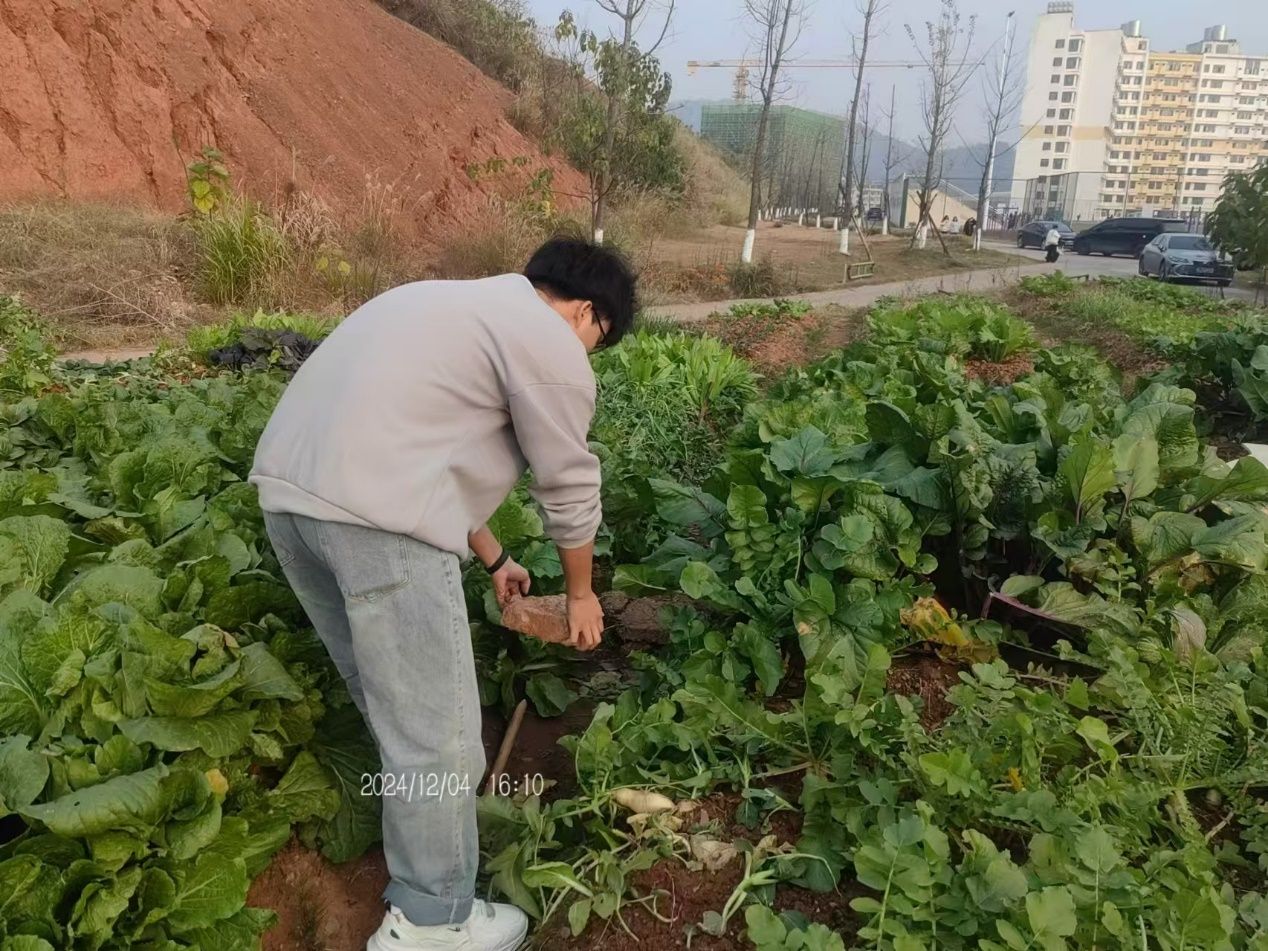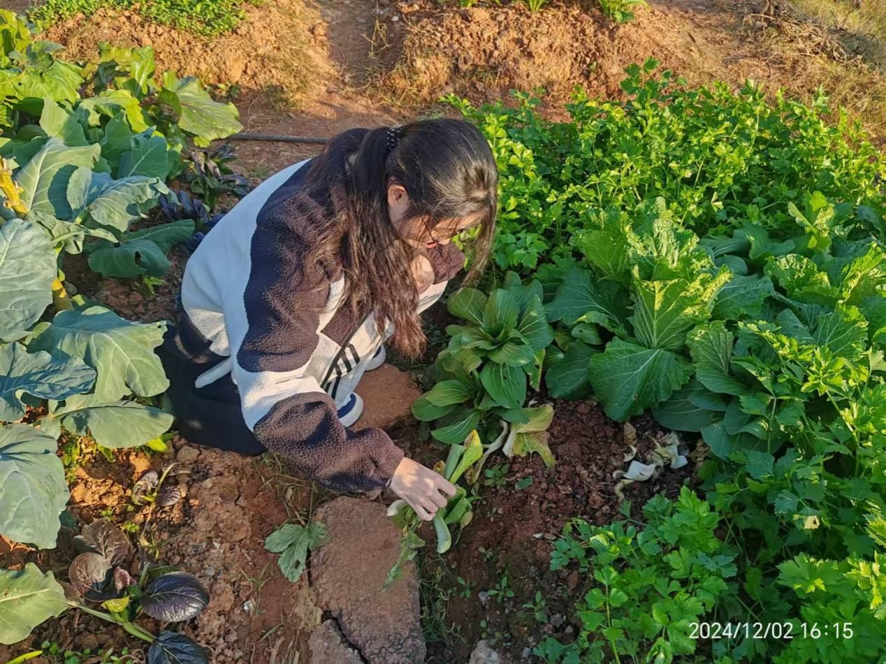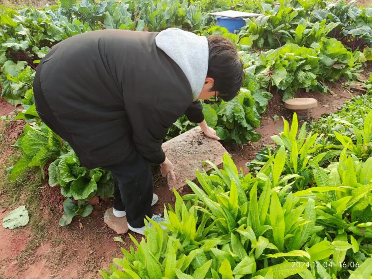 此外,同学们还肩负起田园清洁工作。他们在菜畦间认真搜寻,将地上的小石头和烂菜叶子一一捡起。这些杂物若不及时清理,会对蔬菜生长环境产生不良影响。同学们认真细致,以实际行动维护田园的整洁。