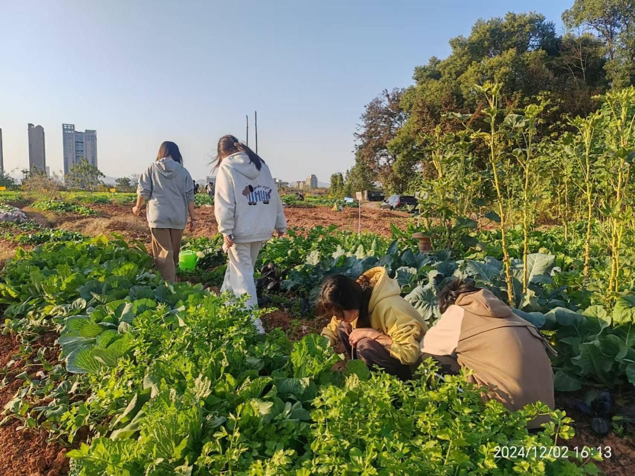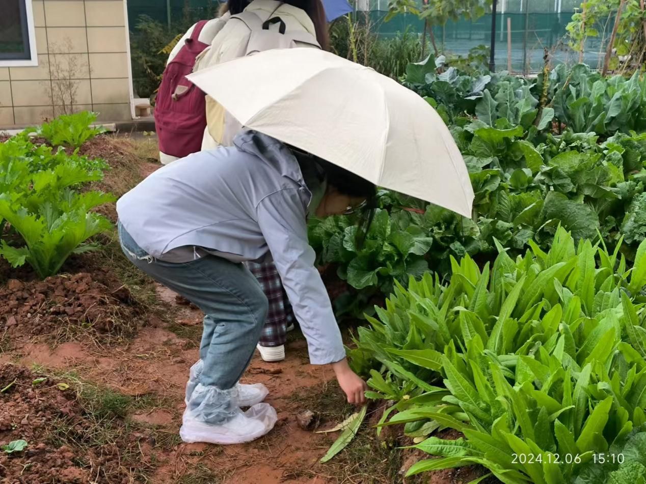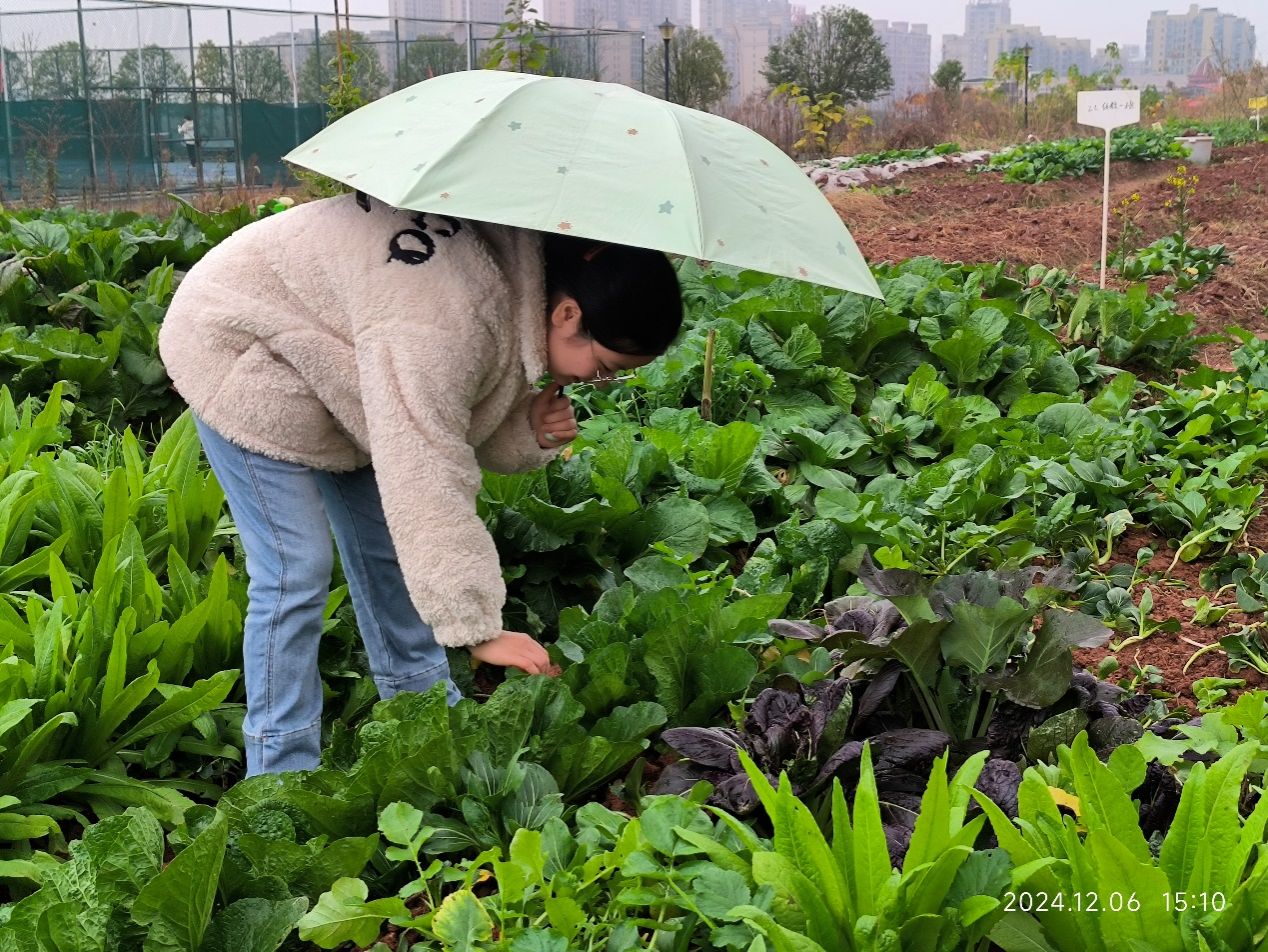 此外,同学们还肩负起田园清洁工作。他们在菜畦间认真搜寻,将地上的小石头和烂菜叶子一一捡起。这些杂物若不及时清理,会对蔬菜生长环境产生不良影响。同学们认真细致,以实际行动维护田园的整洁。