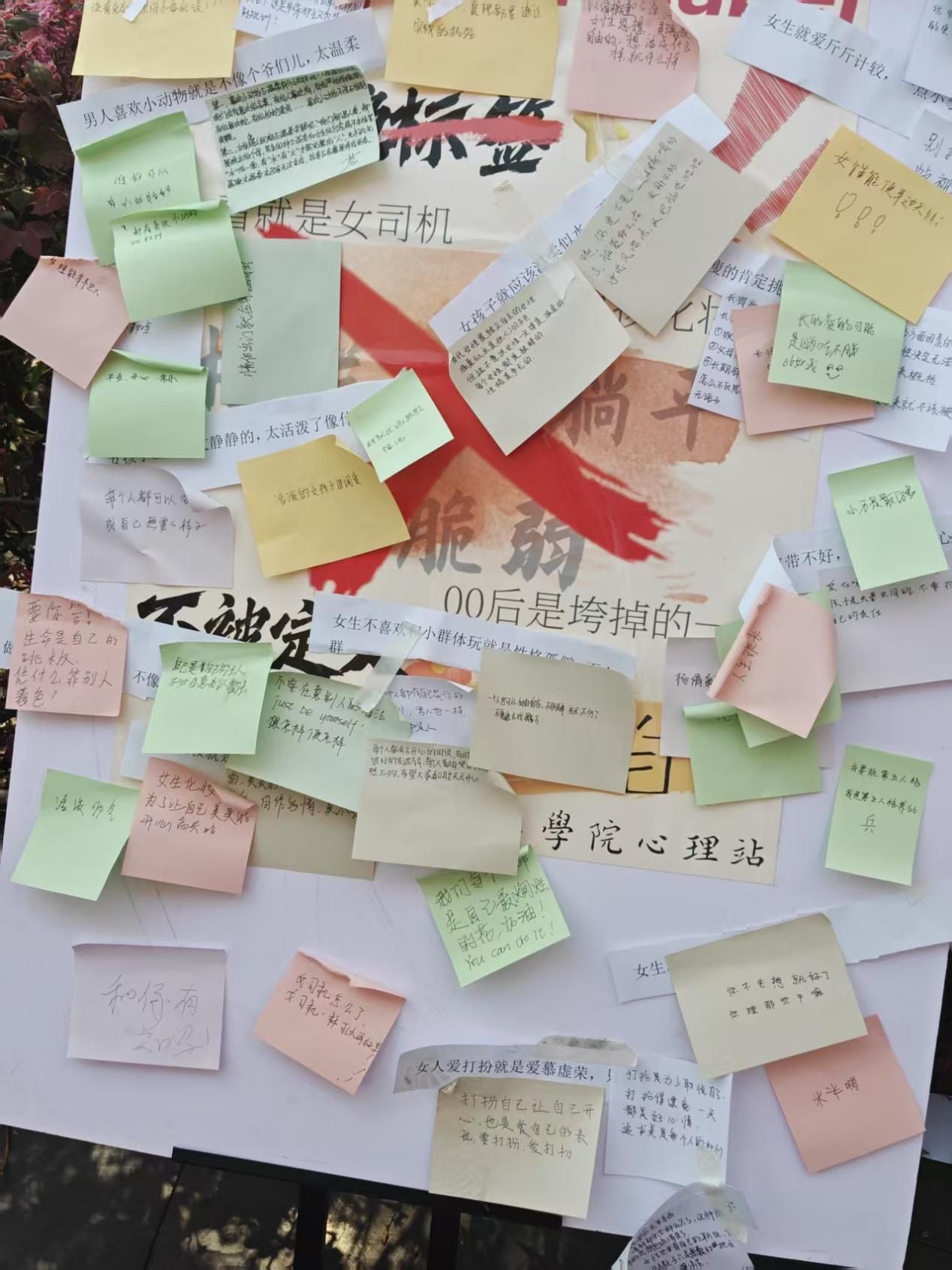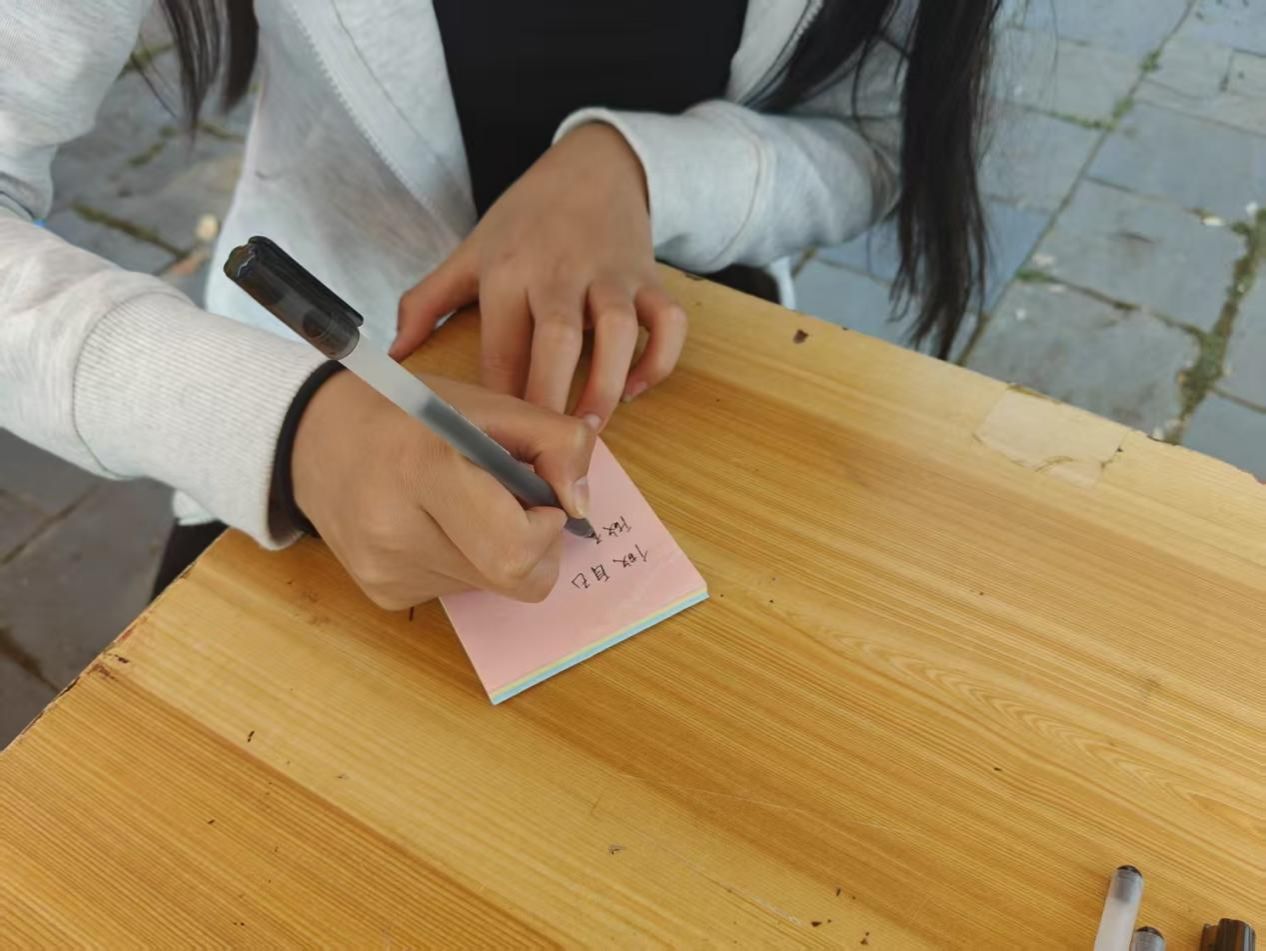 撕下标签后,同学们纷纷移步至桌台前,拿起笔在便利贴上认真书写。有的同学写下“我开朗又善良,未来一片光明”,以坚定的笔触表达对自我的正确认知;还有同学写下“愿你每天都能嘴角上扬”,将温暖的祝福传递给他人。一笔一画,都是同学们内心深处对积极、友善交流环境的渴望。随后,大家将写满寄语的便利贴贴在人形板旁,不一会儿,便形成了一面色彩斑斓的寄语墙,成为校园里一道充满正能量的独特风景。