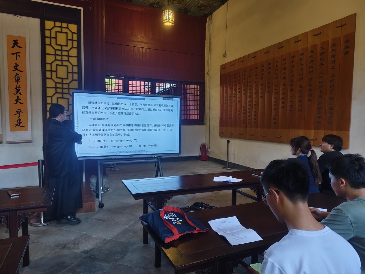 本次培训围绕练声、普通话发音与语言表达、展厅讲解实训三大模块展开。活动伊始,学员们通过口部操、发声练习提升普通话水平,为清晰传递文化内涵奠定基础。其次在展厅实训环节,博物馆资深讲解员从礼仪规范、沟通技巧、孔庙历史沿革等方面进行系统讲授,并通过示范站姿、手势及语言表达,帮助学员掌握讲解的核心要领。随后学员们跟随讲解员实地学习孔庙建筑特色、儒家文化内涵及文物背后的历史故事。