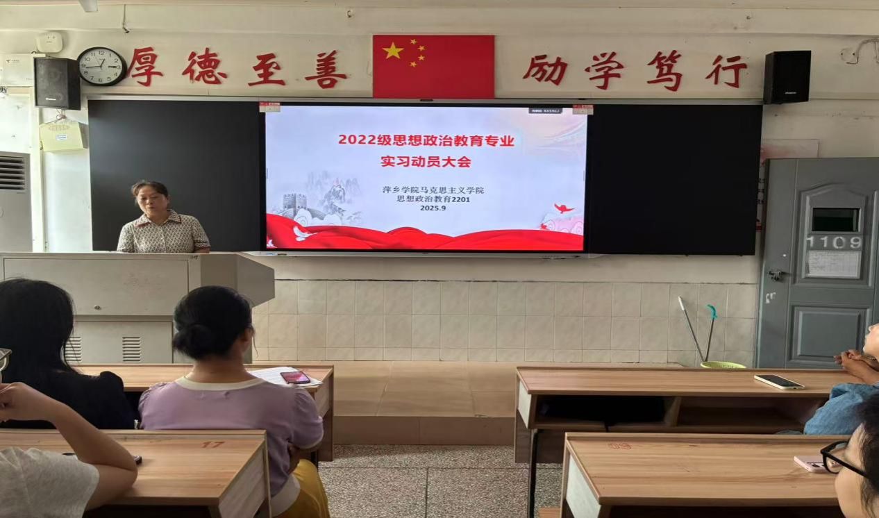 为推动22思政班学生实习工作的顺利开展,2025年9月9日,马克思主义学院在跬步楼1109教室召开了22级思想政治教育专业教育实习动员大会,本次会议由思政教研室主任刘根梅老师主持,马克思主义院长朱红英、全体实习指导老师及22级思想政治教育专业全体学生。