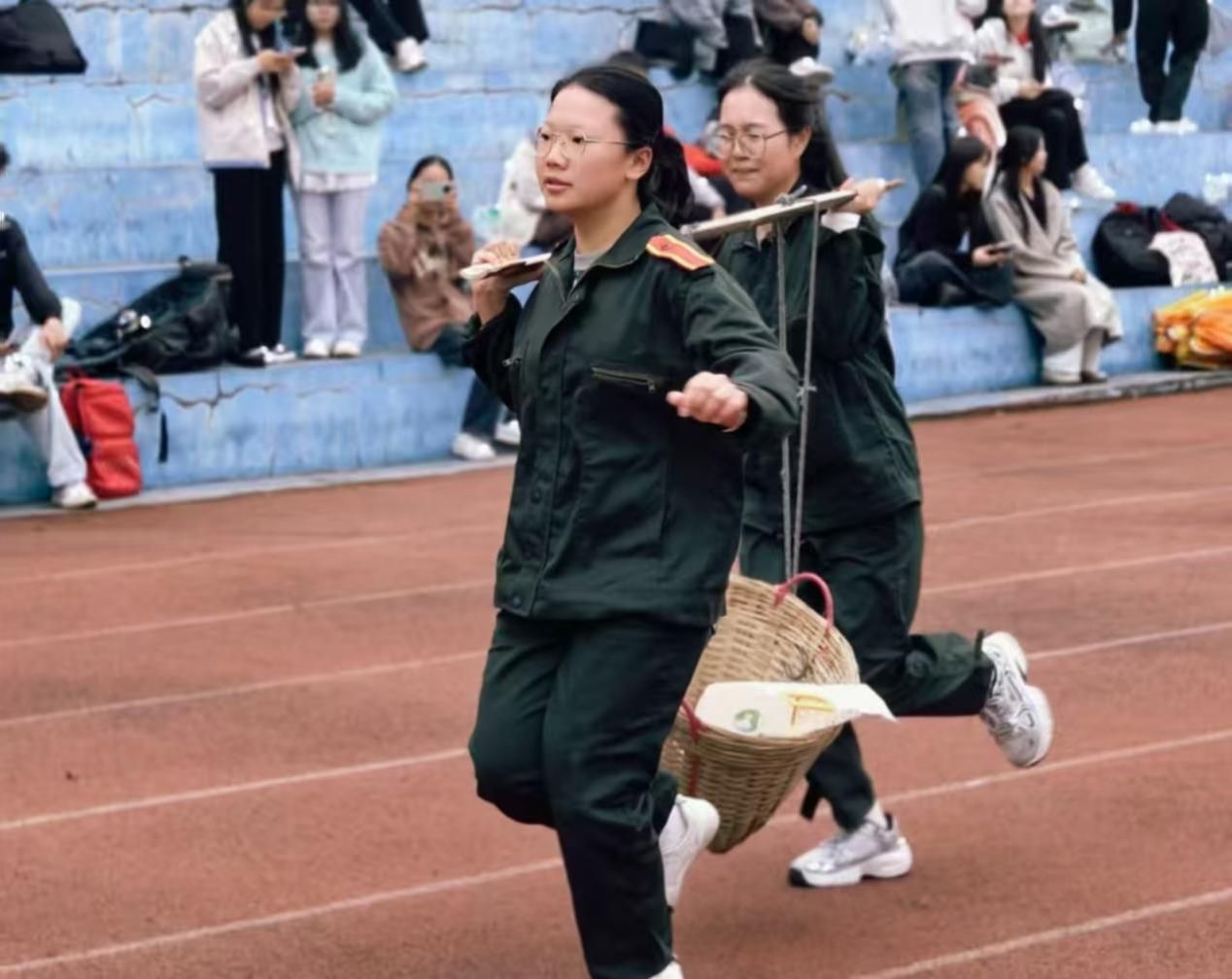 首先进行的是 “支前运输” 竞速赛(模拟群众支援前线)。两人一组,利用扁担、箩筐等工具协作往返跑。赛场上,运动员们斗志昂扬,配合默契,既要争分夺秒,又要确保物资完好无损。呐喊声、助威声此起彼伏,场面紧张而热烈。他们的团队协作能力弘扬了团结奋进的支前精神。