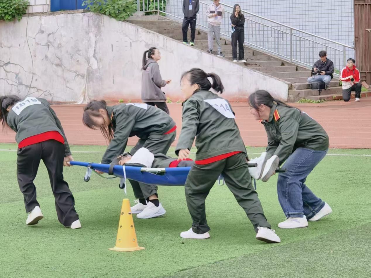 最后进行的是“战地救护”接力赛。赛场上运动员们抬起伤员,迅速转移阵地,完美复刻了战场的紧迫与有序,浓烈的战场氛围瞬间笼罩全场。四名队员扛着“伤员”在草地上奋力冲刺,额头滚落的汗珠折射出战斗的光芒。此次比赛充分铸就了我们马院学子团队协作的钢铁精神。