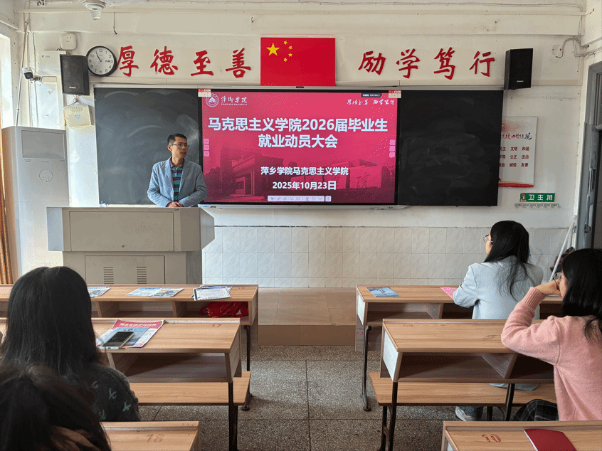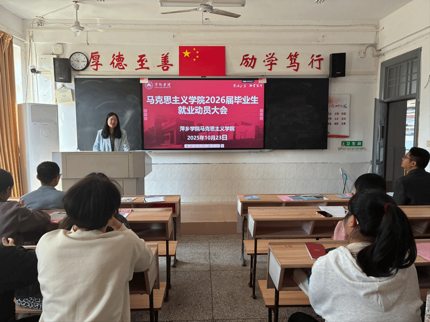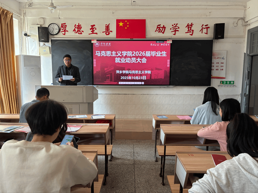 10月24日,马克思主义学院在跬步楼1109教室召开2026届毕业生就业动员大会。学院党委书记宋波、党委副书记易亮、学工科科长陈尧嘉、22思政班班主任欧阳琴以及我院全体2026届毕业生参加了此次动员会。