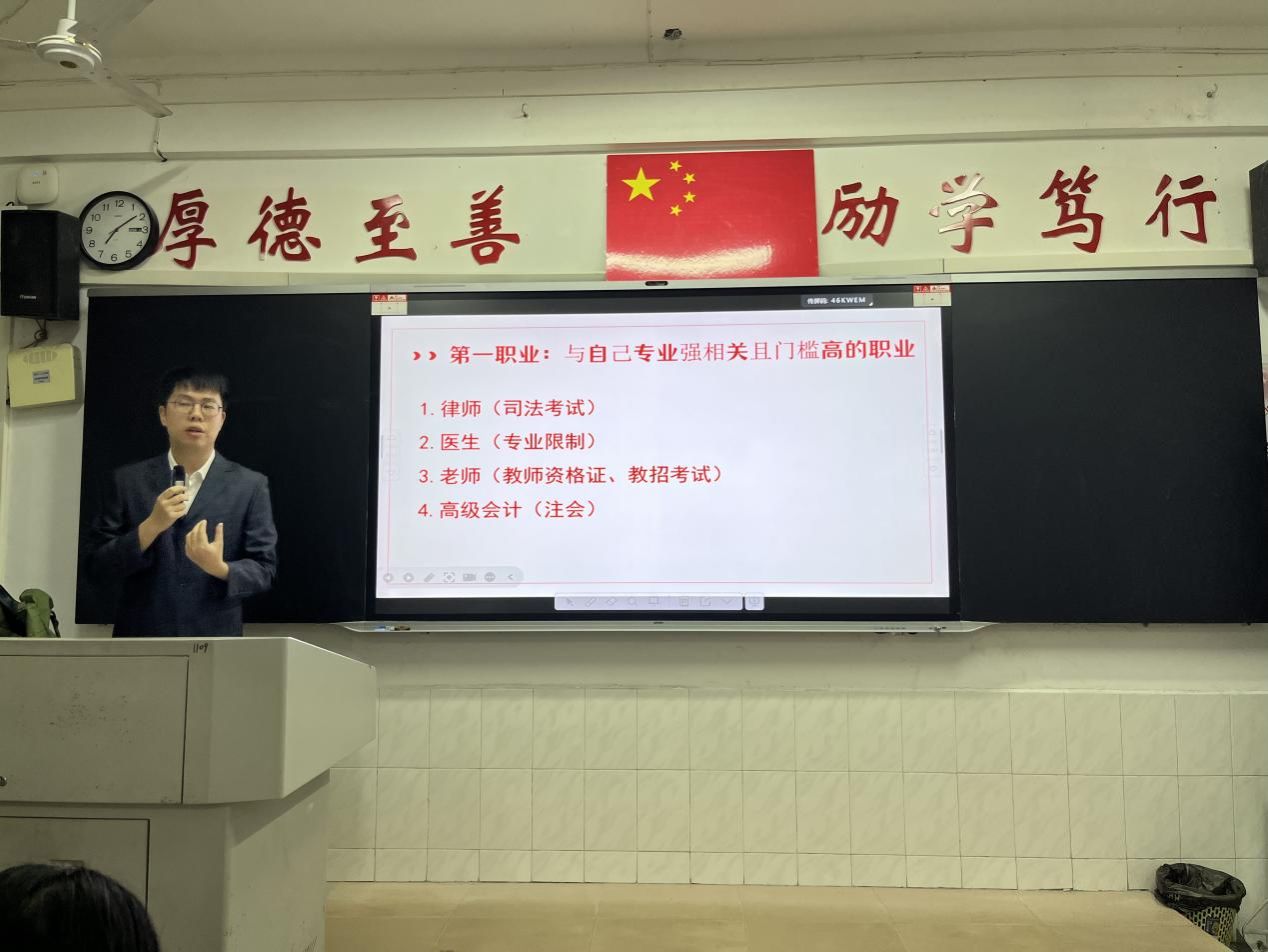 活动伊始,熊猫老师以“浅谈职业规划”为切入点,结合大学生成长特点,率先抛出“你的职业理想是什么?”这一直击人心的问题与现场学生互动起来。同学们积极发言,分享自己对未来职业的憧憬与困惑,现场氛围瞬间活跃起来。在认真倾听同学们的想法后,熊猫老师深入剖析了职业规划的核心意义,强调职业规划是人生发展的“指南针”,同学们需立足自身专业特长、性格特质和职业愿景,理性分析行业趋势与岗位需求,避免盲目跟风择业,在探索中明确方向,为未来发展筑牢基础。