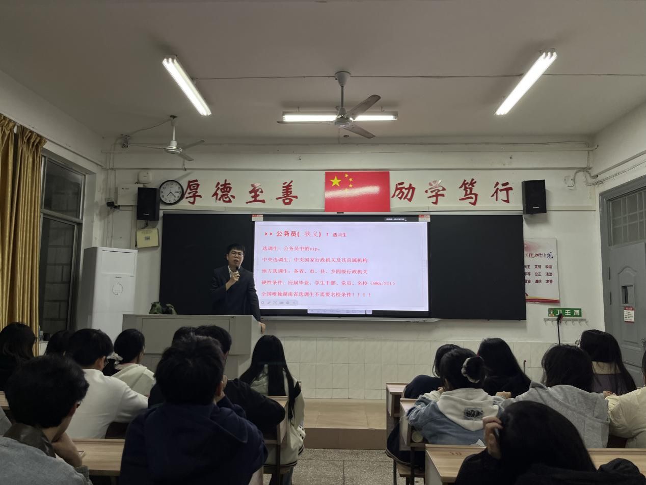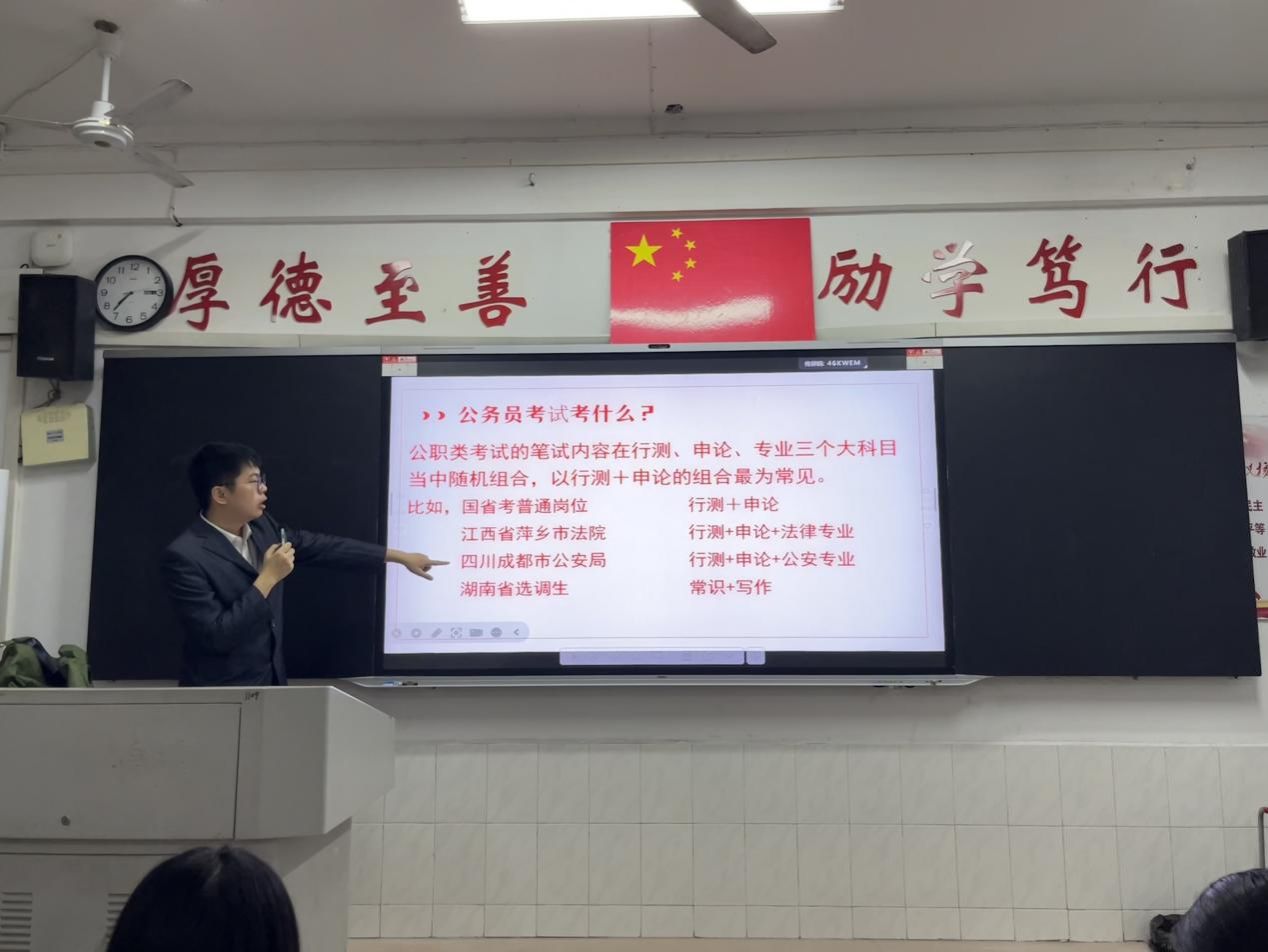 为切实帮助我院2023级、2024级学生找准职业定位,系统掌握公务员考试备考要点,11月5日,马克思主义学院特邀萍乡市萍公教育培训师熊猫老师赴我院开展公务员考试备考公益课。我院2023级、2024级学生踊跃到场,现场座无虚席,学习氛围浓厚,交流会由我院学工科科长陈尧嘉主持。