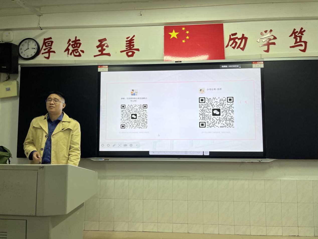 考公备考计划制定是本次公益课的核心内容,熊猫老师围绕“如何进入公务员队伍”展开系统讲解,每一个知识点都干货满满。他先通过流程图的形式,清晰梳理了完整报考流程:从发布公告、组织报名,到笔试、面试,再到体检政审、公示录用,每个环节的关键节点与注意事项都逐一说明,随后,他展示了岗位要求模板,结合马克思主义学院专业特色,举例解读了学历、专业、政治面貌等核心报考条件。针对考试内容,熊猫老师重点介绍了行测、申论两大科目,结合真题片段拆解题型特点,并明确了国考、省考等各类考试的时间安排。此外,他还分享了实用的选岗推荐流程,提醒同学们结合自身优势合理选择岗位,同时强调大学期间需提前做好知识储备、时政积累等准备工作,并给出了详细的考公时间表,为同学们规划备考进程提供了具体指引。