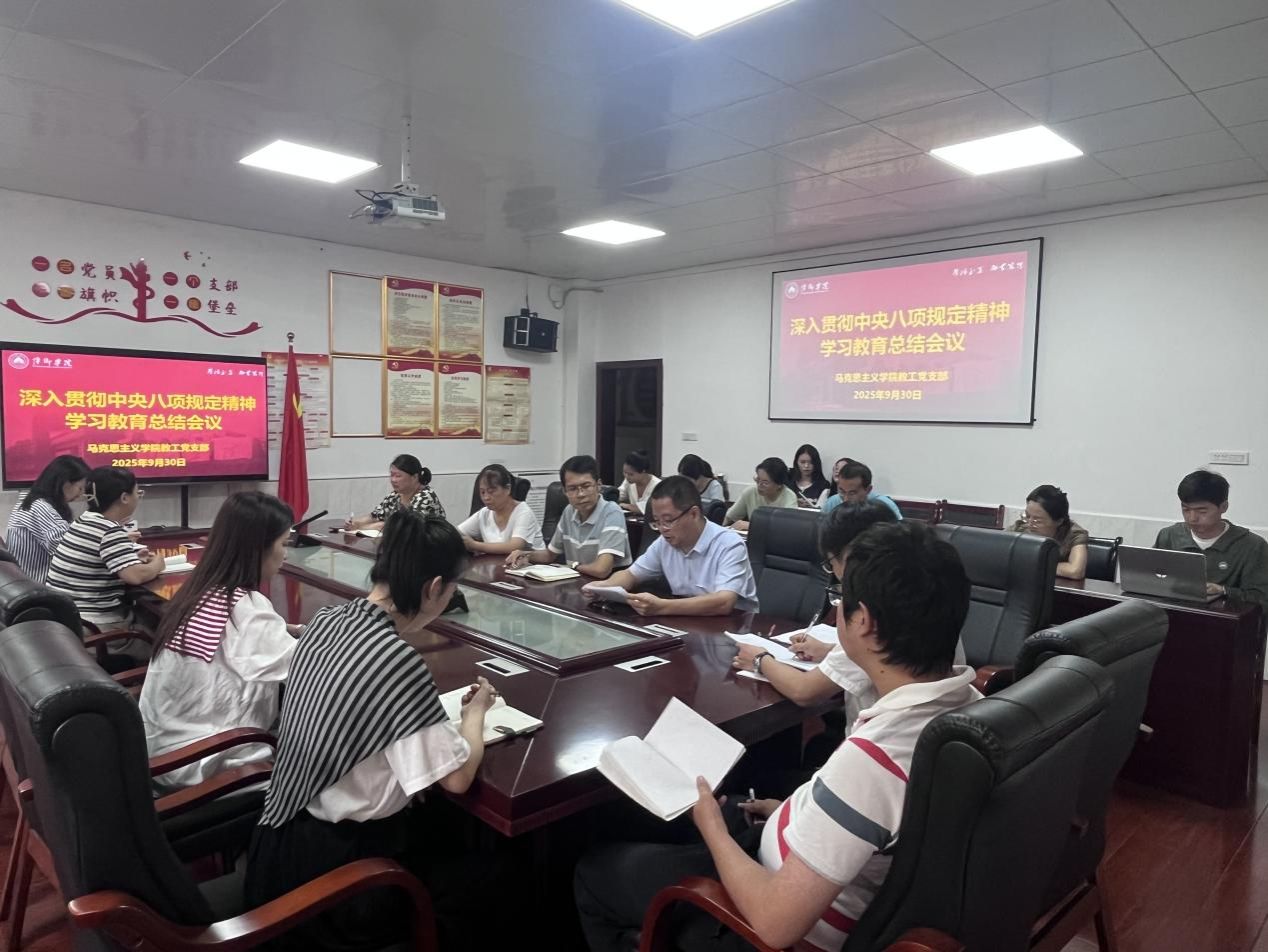 为持续巩固中央八项规定精神学习教育成果,推动作风建设常态化长效化,9月30日上午,马克思主义学院教工党支部在跬步楼1214会议室召开深入贯彻中央八项规定精神学习教育总结会议。会议由教工党支部书记易亮主持,支部全体党员参加。