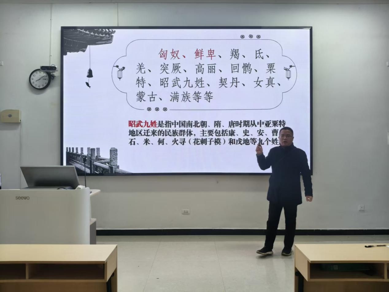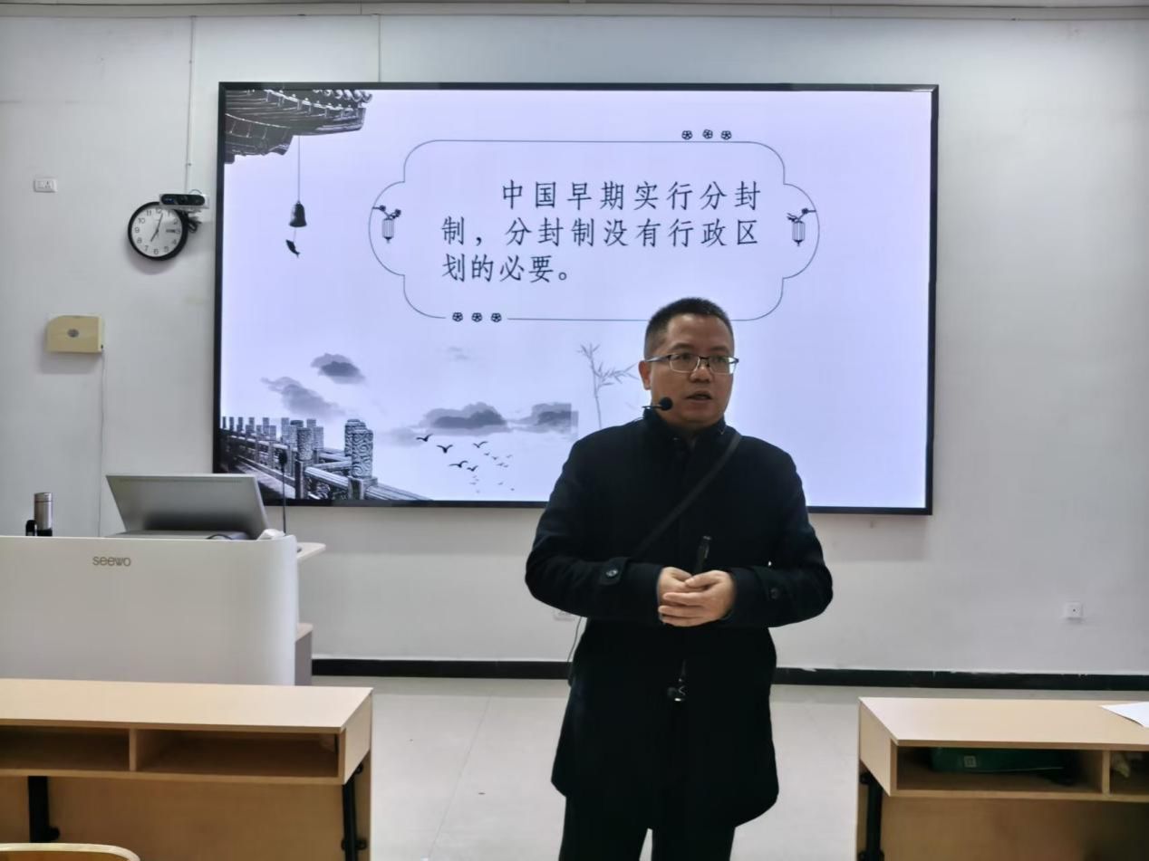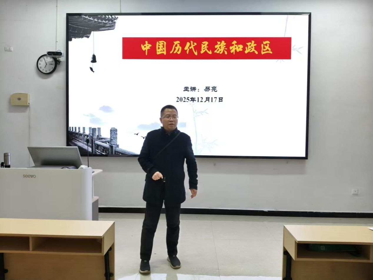 为学习贯彻党的二十届四中全会精神,铸牢中华民族共同体意识,推进中华民族共同体建设,我院党委副书记易亮于12月17日19点,在英华楼3106举办“中国历代民族和政区”讲座,马克思主义学院党员和入党积极分子,思想政治教育2501班,以及商学院知识产权2401班全体同学参加讲座。