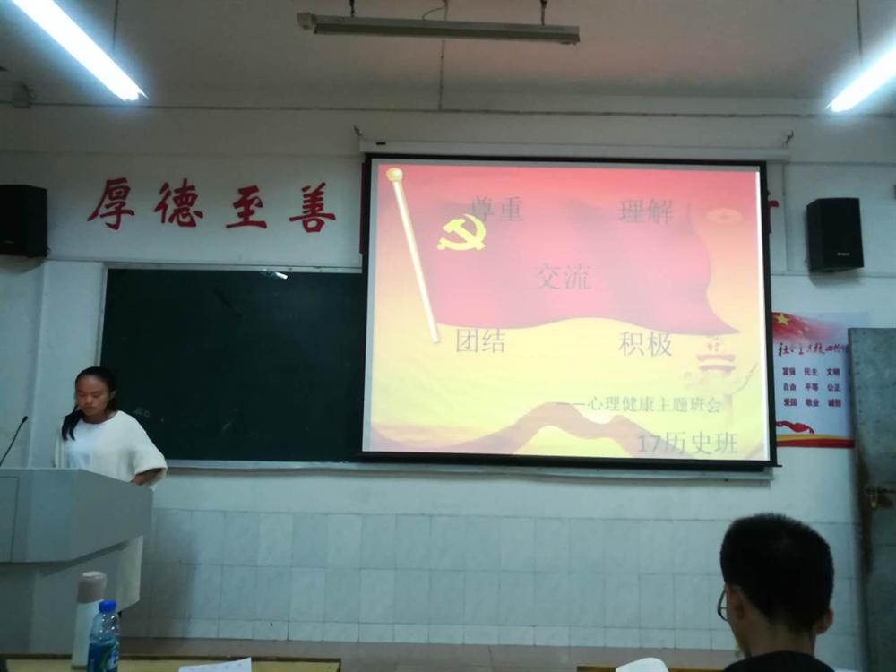 为了提高同学们的心理健康素质,培养优秀品德,10月31日晚,17历史班在跬步楼1111教室召开“尊重、理解、交流、团结、积极”心理健康主题班会。班会由历史班副团支书兼心理健康委员易水兰主持。