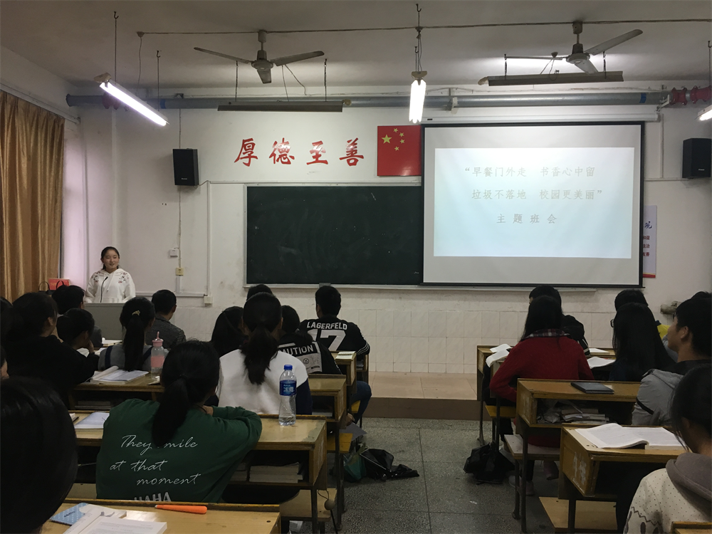 为了加强同学们的环保意识,建设书香校园,17法律班于10月16日下午在跬步楼1108教室,举行了“早餐门外走、书香心中留、垃圾不落地、校园更美丽”主题班会。全班同学积极参与,并发表了自己的意见。班主任郑瑾瑜老师全程指导。