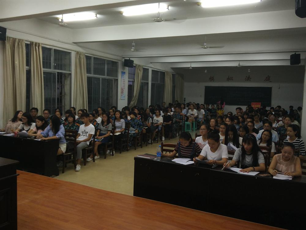 为全面做好2017年的招新工作,9月13日晚上,我院团总支学生会于英华楼模拟法庭举行了招新动员大会。我院团总支书记罗燕妮老师出席并主持召开大会,团总支副书记黄彦润、学生会主席段崇裕、学生党员代表周俊杰、团总支学生分会各部门部长以及17级全体新生参加会议。